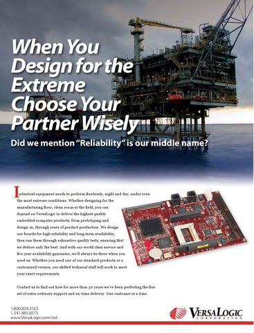 the most extreme conditions. Whether designing for the manufacturing oor, clean room or the eld, you can depend on VersaLogic to deliver the highest quality embedded computer products, from prototyping and design-in, through years of product production. We design our boards for high reliability and long-term availability, then run them through exhaustive quality tests, ensuring that we deliver only the best. And with our world class service and ve year availability guarantee, we’ll always be there when you need us. Whether you need one of our standard products or a customized version, our skilled technical staff will work to meet your exact requirements. Contact us to nd out how for more than 30 years we’ve been perfecting the ne art of extra-ordinary support and on-time delivery: One customer at a time.