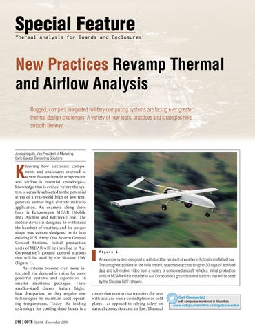 and knowledge that is critical before the syswww.cotsjournalonline.com/getconnected tem is actually subjected to the potential stress of a real-world high or low temperature and/or high altitude mil/aero application. An example along those lines is Echostorm’s MDAR (Mobile Data Archive and Retrieval) box. The Get Connected with technology and companies providing solutions now mobile device is designed to withstand Get Connected is a new resource for further exploration into products, technologies and companies. Whether your goal is to research th datasheet from a company, speak directly with an Application Engineer, or jump to a company's technical page, the goal of Get Connect the harshest of weather, and its unique in touch with the right resource. Whichever level of service you require for whatever type of technology, shape was custom-designed to fit into Get Connected will help you connect with the companies and products you are searching for. existing U.S. Army One System Ground www.cotsjournalonline.com/ge Control Stations. Initial production units of MDAR will be installed in AAI Figure 1 Corporation’s ground control stations that will be used by the Shadow UAV An example system designed to withstand the harshest of weather is Echostorm’s MDAR box. (Figure 1). The unit gives soldiers in the field instant, searchable access to up to 30 days of archived As systems become ever more indata and full-motion video from a variety of unmanned aircraft vehicles. Initial production tegrated, the demand is rising for more units of MDAR will be installed in AAI Corporation’s ground control stations that will be used powerful systems and capabilities in by the Shadow UAV (shown). smaller electronic packages. These smaller-sized chassis feature higher heat dissipation, so they require new convection system that transfers the heat Get Connected with companies and Get Connected technologies to maintain cool operat- with acutane water-cooled plates or cold products featured in this section. with companies mentioned in this article. ing temperatures. Today the leading plates—as opposed to relying solely on www.cotsjournalonline.com/getconnected www.cotsjournalonline.com/getconnected technology for cooling these boxes is a natural convection and airflow. Thermal