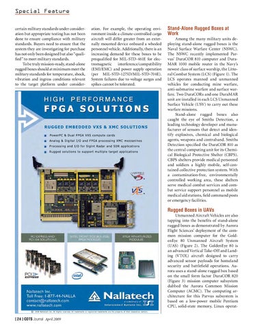 Special Feature certain military standards under consideration but appropriate testing has not been done to ensure compliance with military standards. Buyers need to ensure that the system they are investigating for purchase has not only been designed but also “qualified” to meet military standards. To be truly mission-ready, stand-alone rugged boxes should at minimum meet the military standards for temperature, shock, vibration and ingress conditions relevant to the target platform under consider-