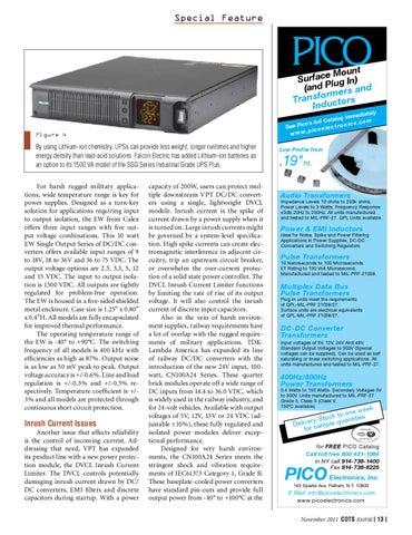 capacity of 200W, users can protect multiple downstream VPT DC/DC converters using a single, lightweight DVCL module. Inrush current is the spike of current drawn by a power supply when it is turned on. Large inrush currents might be governed by a system-level specification. High spike currents can create electromagnetic interference in adjacent circuitry, trip an upstream circuit breaker, or overwhelm the over-current protection of a solid state power controller. The DVCL Inrush Current Limiter functions by limiting the rate of rise of its output voltage. It will also control the inrush current of discrete input capacitors. Also in the vein of harsh environment supplies, railway requirements have a lot of overlap with the rugged requirements of military applications. TDKLambda America has expanded its line of railway DC/DC converters with the introduction of the new 24V input, 100watt, CN100A24 Series. These quarter brick modules operate off a wide range of DC inputs from 14.4 to 36.0 VDC, which is widely used in the railway industry, and for 24-volt vehicles. Available with output voltages of 5V, 12V, 15V or 24 VDC (adjustable ±10%), these fully regulated and isolated power modules deliver exceptional performance. Designed for very harsh environments, the CN100A24 Series meets the stringent shock and vibration requirements of IEC61373 Category 1, Grade B. These baseplate-cooled power converters have standard pin-outs and provide full output power from -40° to +100°C at the