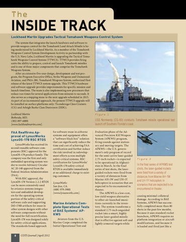 INSIDE TRACK Lockheed Martin Upgrades Tactical Tomahawk Weapons Control System The system that integrates the launch hardware and software to provide weapon control for the Tomahawk Land Attack Missile is being modernized by Lockheed Martin. As a member of the Tomahawk Weapons Control System Development Activity in partnership with the U.S. Navy Labs, Lockheed Martin is upgrading the Tactical Tomahawk Weapons Control System (TTWCS). TTWCS provides firing units the ability to prepare, control and launch Tomahawk missiles and is one of three major components that comprise the Tomahawk Weapons System. After an extensive five-year design, development and test program, the Program Executive Office, Strike Weapons and Unmanned Aviation, and PMA-280, Tomahawk Weapons System, authorized fleet release of the latest TTWCS system upgrade. This TTWCS hardware and software upgrade provides improvements for specific mission and launch timelines. The team is also implementing new processors that reduce run-times for several applications from minutes to seconds. It also serves as a stepping stone to the next upgrade scheduled in 2015. As part of an incremental approach, the present TTWCS upgrade will be installed on surface platforms only: Ticonderoga Class Cruisers (CG) and Arleigh Burke Class Destroyers (DDG). Lockheed Martin Bethesda, MD. (301) 897-6000. [www.lockheedmartin.com].