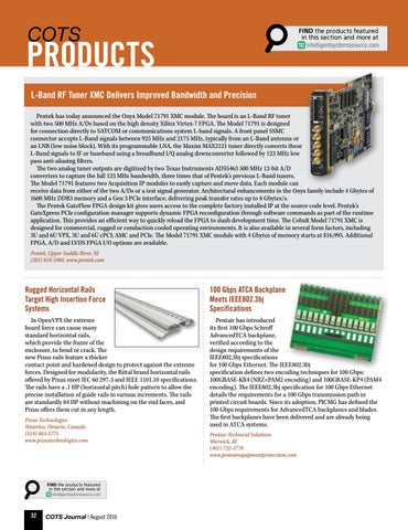 L-Band RF Tuner XMC Delivers Improved Bandwidth and Precision Pentek has today announced the Onyx Model 71791 XMC module. The board is an L-Band RF tuner with two 500 MHz A/Ds based on the high density Xilinx Virtex-7 FPGA. The Model 71791 is designed for connection directly to SATCOM or communications system L-band signals. A front panel SSMC connector accepts L-Band signals between 925 MHz and 2175 MHz, typically from an L-Band antenna or an LNB (low noise block). With its programmable LNA, the Maxim MAX2121 tuner directly converts these L-Band signals to IF or baseband using a broadband I/Q analog downconverter followed by 123 MHz low pass anti-aliasing filters. The two analog tuner outputs are digitized by two Texas Instruments ADS5463 500 MHz 12-bit A/D converters to capture the full 123 MHz bandwidth, three times that of Pentek’s previous L-Band tuners. The Model 71791 features two Acquisition IP modules to easily capture and move data. Each module can receive data from either of the two A/Ds or a test signal generator. Architectural enhancements in the Onyx family include 4 Gbytes of 1600 MHz DDR3 memory and a Gen 3 PCIe interface, delivering peak transfer rates up to 8 Gbytes/s. The Pentek GateFlow FPGA design kit gives users access to the complete factory installed IP at the source code level. Pentek’s GateXpress PCIe configuration manager supports dynamic FPGA reconfiguration through software commands as part of the runtime application. This provides an efficient way to quickly reload the FPGA to slash development time. The Cobalt Model 71791 XMC is designed for commercial, rugged or conduction cooled operating environments. It is also available in several form factors, including 3U and 6U VPX, 3U and 6U cPCI; AMC and PCIe. The Model 71791 XMC module with 4 Gbytes of memory starts at $16,995. Additional FPGA, A/D and LVDS FPGA I/O options are available. Pentek, Upper Saddle River, NJ (201) 818-5900. www.pentek.com