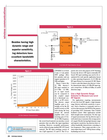 C5532EDC in a 6-lead, 2 mm x 2 mm plastic DFN package offers er exploration 2200 ether your goal TA=25°C low parasitics and can speak directly 2000 support operation to 12 ical page, the 1800 ght resource. GHz and higher. technology, Figure 1 shows this 1600 es and products 12 GHz detector’s 1400 ed RF input matched to 1200 11.5 GHz – 12 GHz. So its input circuit 1000 can be connected to 800 the coupled output 600 of a directional coucompanies providing solutions now pler or an RF source. exploration into products, technologies 400 and companies. Whether your goal is to research the latest datasheet from a company, mp to a company's technical page, the goal of Get Connected is to put you in touch with the right resource. Whichever of Theleveldetector output gy, Get Connected will help200 you connect with the companies and products you are searching for. amplifier gain is exonnected 0 ternally set by the R2 -24 -20 -16 -12 -8 -4 0 4 8 and R3 resistors at 10k RF Input Power (dBm) each closing the loop around the internal amplifier with a non12 GHz Detector Characteristics inverting gain of two. At 12 GHz frequency, the circuit board material can introduce circuit parasitics that can affect the input impedance matching. However, acceptable performance can be achieved using standard FR-4 PC board Get Connected with companies mentioned in this article. material. The RF input matching consists of www.portabledesign.com/getconnected two 1.2pF capacitors, C1 and C3. The C3 ca-