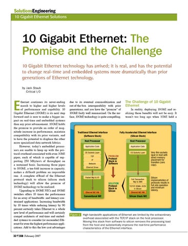 thernet continues its never-ending march to higher and higher levels of performance and capability. 10 Gigabit Ethernet (10GbE) is its next step forward and is sure to make a bigger impact on real-time and embedded systems than any prior advancement. 10GbE holds the promise to provide an order of magnitude increase in performance, maintain compatibility with its prior variants, and to have the potential to displace the other more specialized data network fabrics. However, today’s embedded processors are unable to keep up with the protocol overhead associated with even 1GbE pipes, each of which is capable of supporting 250 Mbytes/s of throughput on a sustained basis. Increasing those pipes to 10GbE, a ten-fold increase in capacity, makes a difficult problem an impossible one. A complete offload of the Ethernet protocol stack to silicon (silicon stack technology) will allow the promise of 10GbE technology to be realized. Upgrading to 10GbE NICs and 10GbE switches offers 10 times the performance for an array of bandwidth- and latency-constrained applications. Increasing bandwidth by 10 times while reducing latency by 90 percent certainly takes Ethernet to a whole new level of performance and will certainly compel architects of real-time and embedded systems to consider (or reconsider) Ethernet for even the highest performance applications. Add to this the low cost advantages 32