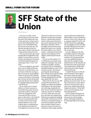 advanced. It is rather for us to be here dedicated to the great task remaining before us—that from these honored retired we take increased devotion to that cause for which they gave the last full measure of devotion—that we here highly resolve that these retired shall not have died in vain—that this SFF market shall have a new birth of freedom—and that government of the engineers, by the engineers, for the engineers, shall not perish from the market. The year was 1984, and the 5.75 x 8” Little Board was unveiled to bring desktop PC technology to the masses. A benign CGA graphics card interface soon gave way to a standardized embedded stackable bus, and a PC/104 ecosystem was born. The American governing body donned big wigs, gloves and hats and assumed the ruling positions. After much deliberation, Little Board ultimately led to the EBX open standard SBC form factor. Halfway into the 30-year cycle, 1999 emerged with much affront to the ramping non-desktop non-backplane boards business. The Asian Invasion was in full swing, brought about by better “biscuit” boards and Socket 370 sockets for customers to install their own CPUs. Sold on price, price and price, the boards were snatched up by all but the most rugged discriminating system OEMs. The same year, the ETX form factor was launched in Europe as a shot heard around the world. More than yet another E-blank-X name, a quiet ruler was born in the form of a revolutionary shift in design methodol-