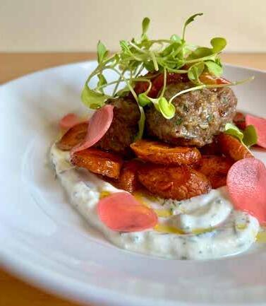 The lamb meatballs with herbed yogurt, spiced carrots, tomato chutney, pickled radish, and radish microgreens. Practically every ingredient on the plate is local. The dish is so light, flavorful, and wellbalanced. All the plates come back clean!