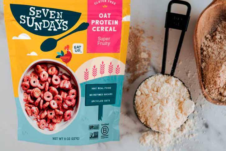 Seven Sundays’ five oat protein cereals— Chocolate Sea Salt, Simply Honey, Maple Cinnamon, Super Fruity, and Golden Apple—are made with upcycled oat protein powder called “Oatgold,” a product extracted from the oats used in the process of manufacturing oat milk and oat cream and developed by SunOpta, a food company based in Eden Prairie, Minn.