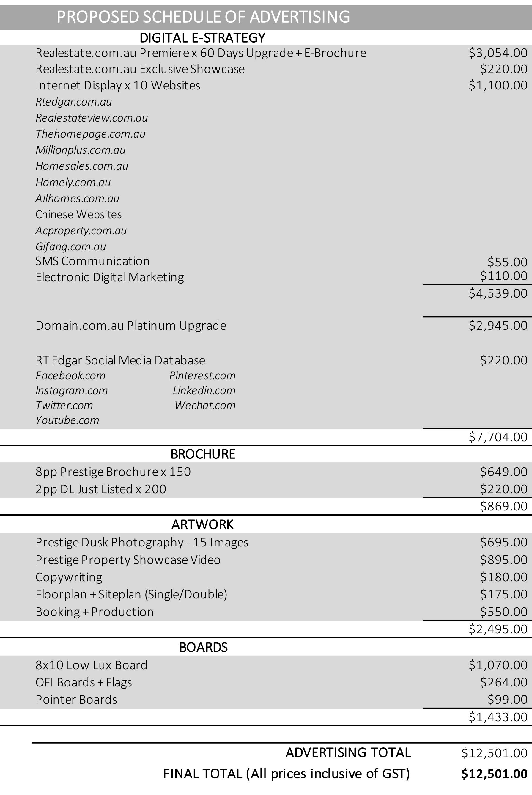 For example we propose 2% plus GST of the purchase price for each sale (50% payable within 60 days of sale and the balance of 50% payable at settlement).