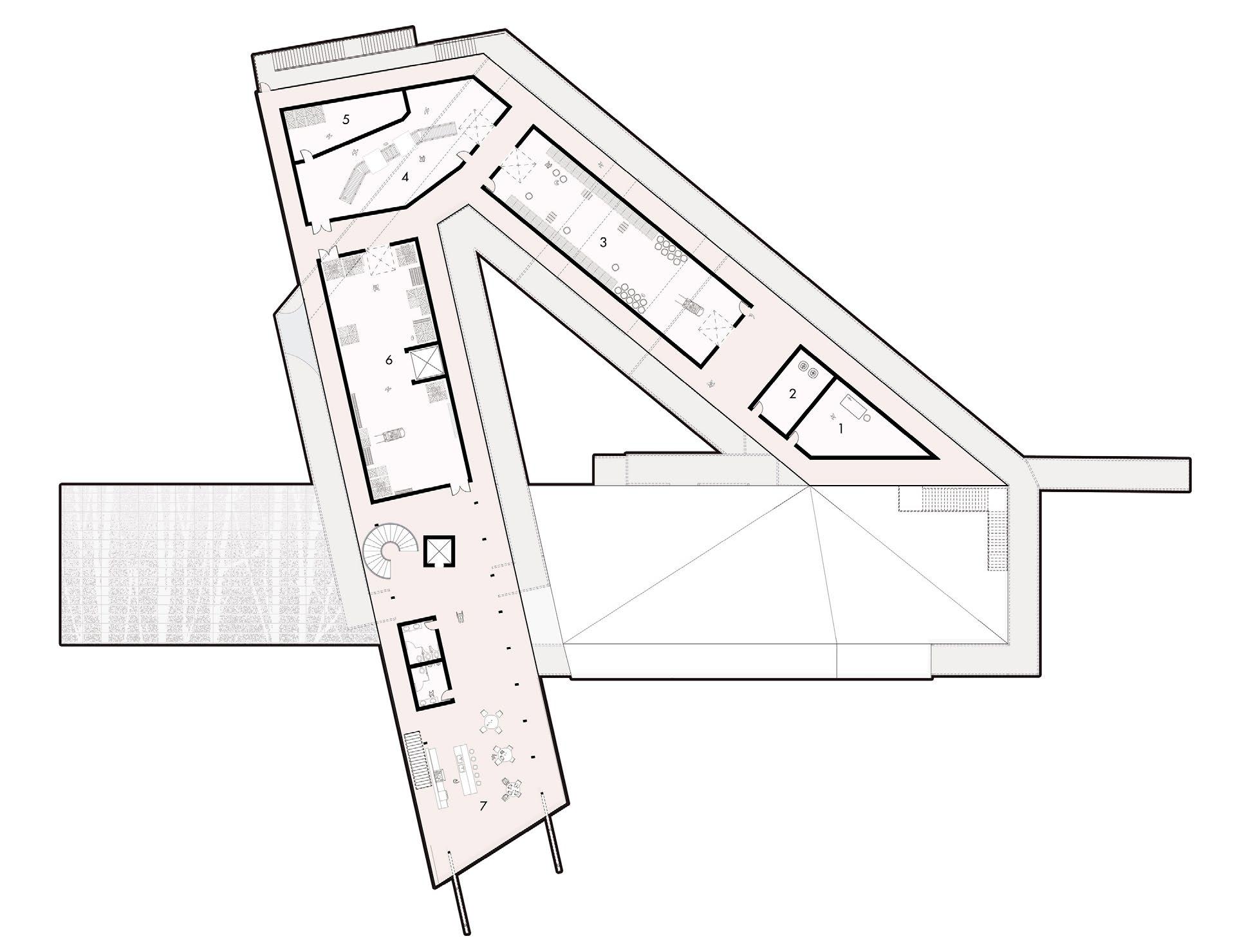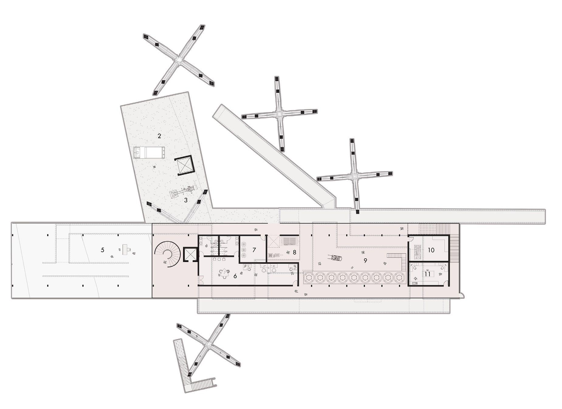 As a winery in a densely wooded area, it was crucial that both the intricate process of distillery and the beauty of the natural surrounding be put on display. As a result, the guest circulation functions primarily in a mezanine level and weaves between inside and out, providing visitors with an immersive experience of that which is both natural and man-made.