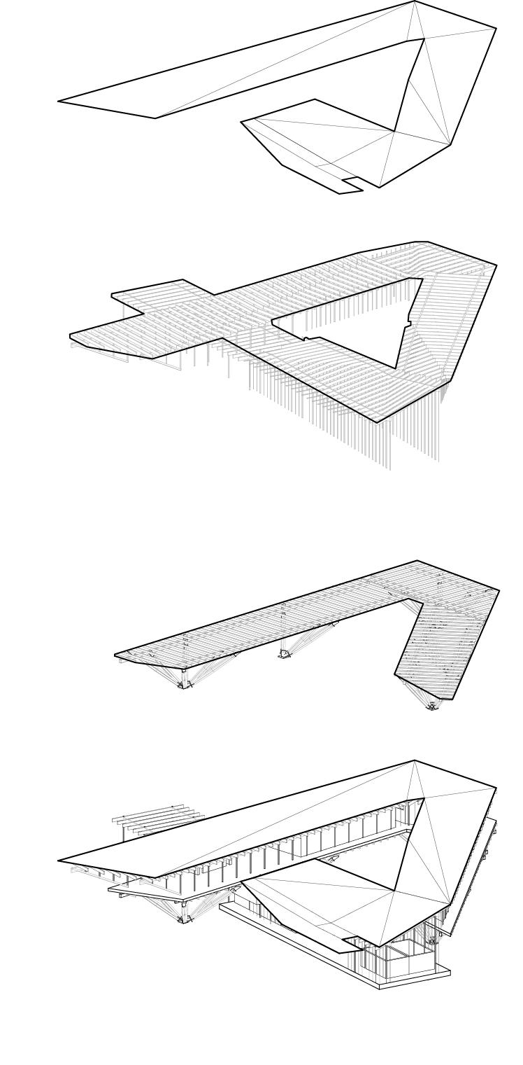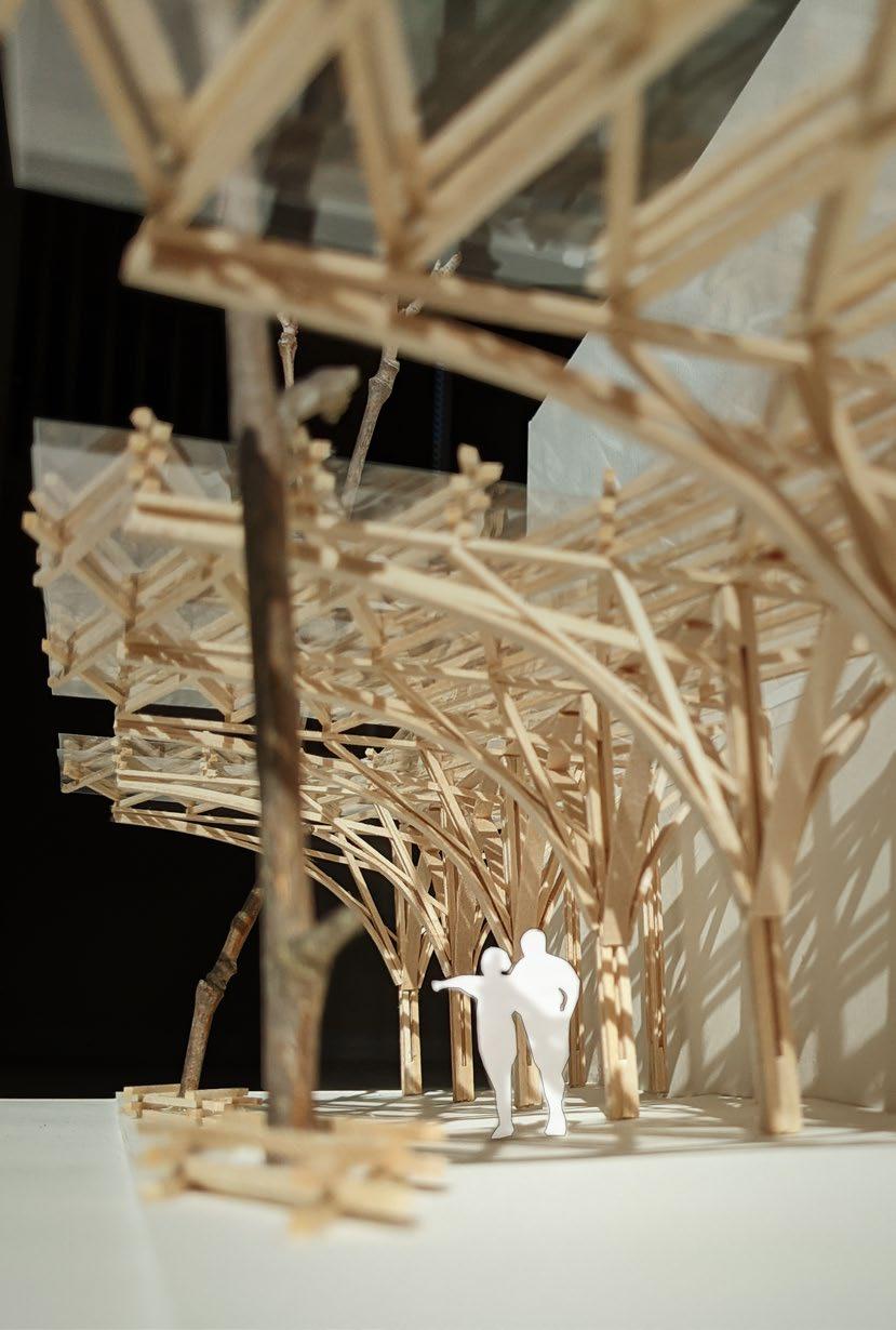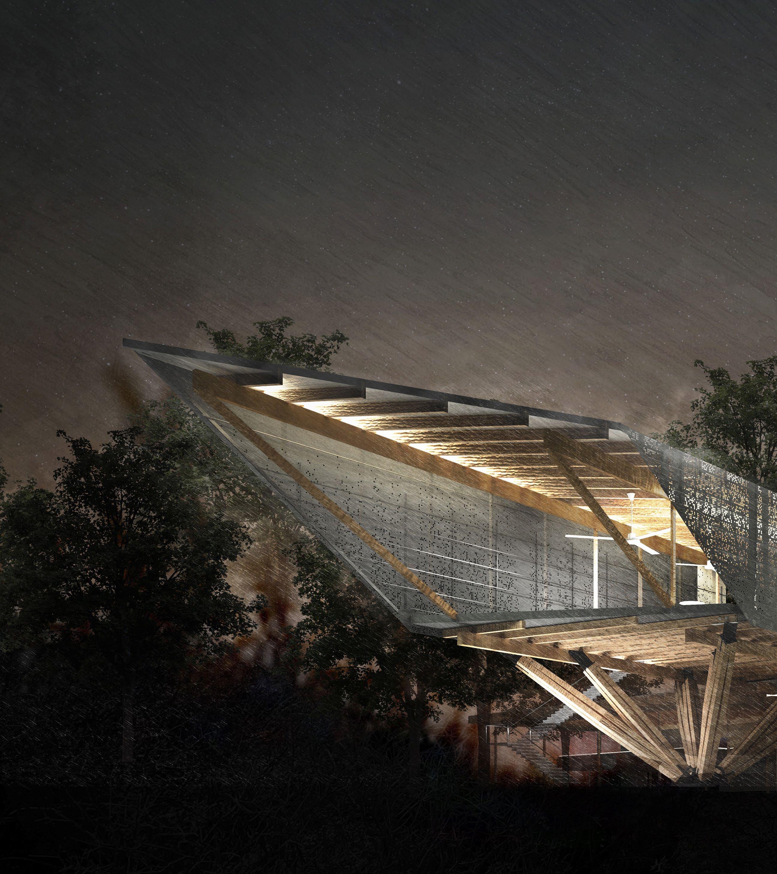 Situated in the center of a natural clearing, the structure bends in on itself to fit within the bounds of the tree formation. This formal gesture simultaneously provides occupants with a panoramic experience of the site as they circulate the structure.