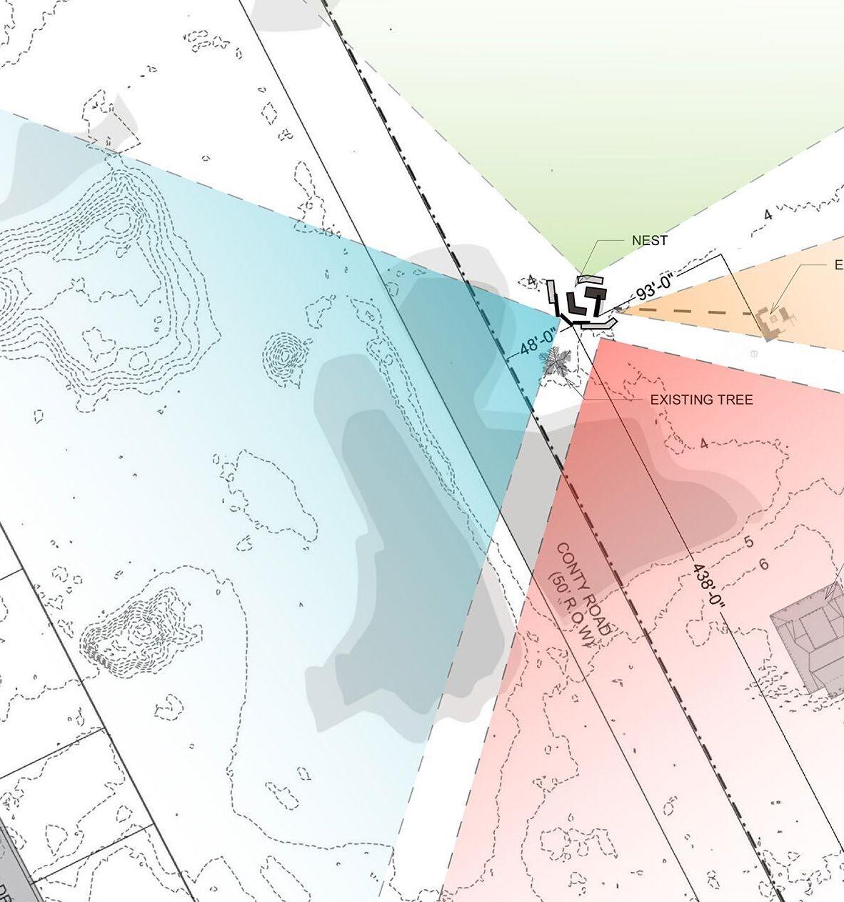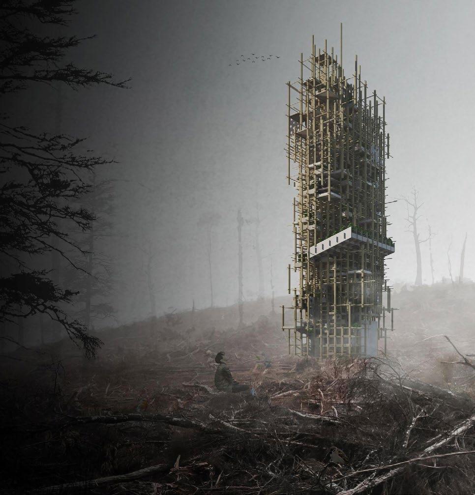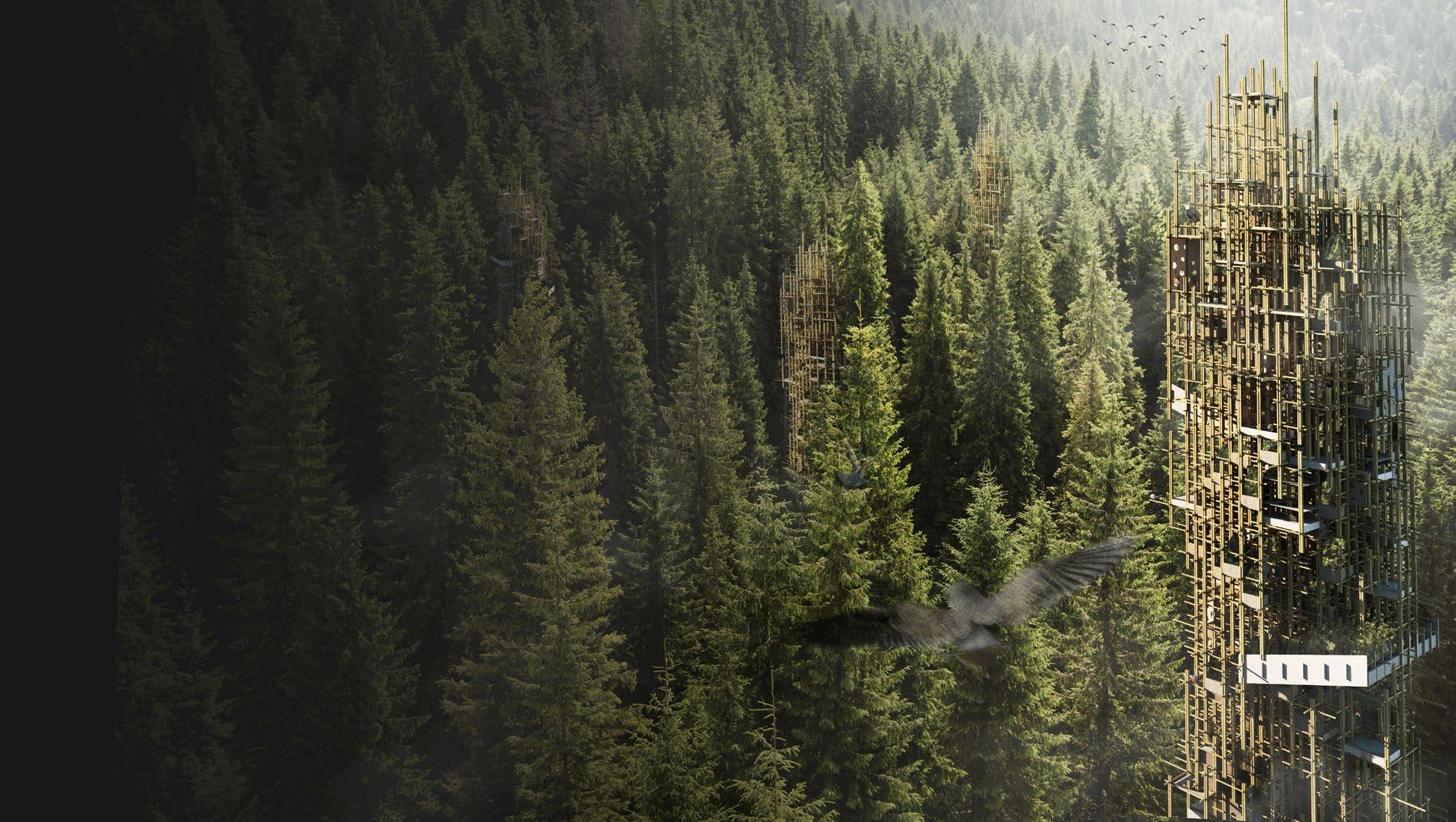 Situated in the center of a natural clearing, the structure bends in on itself to fit within the bounds of the tree formation. This formal gesture simultaneously provides occupants with a panoramic experience of the site as they circulate the structure.