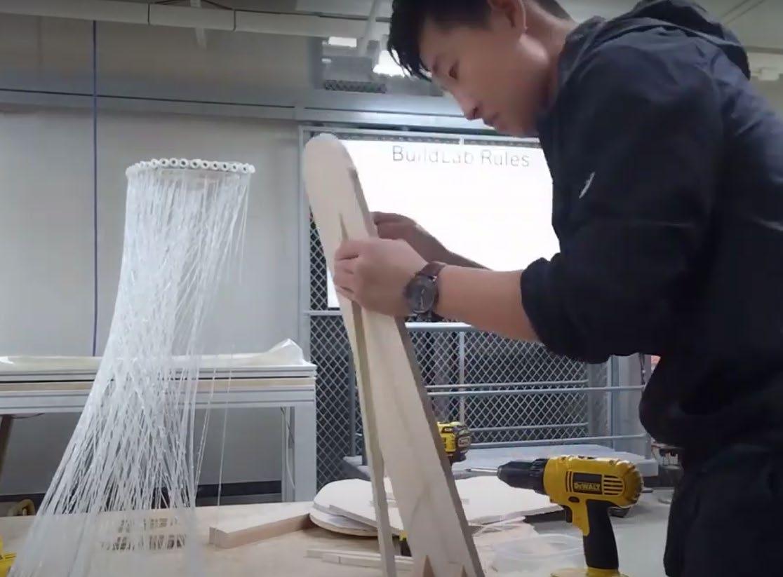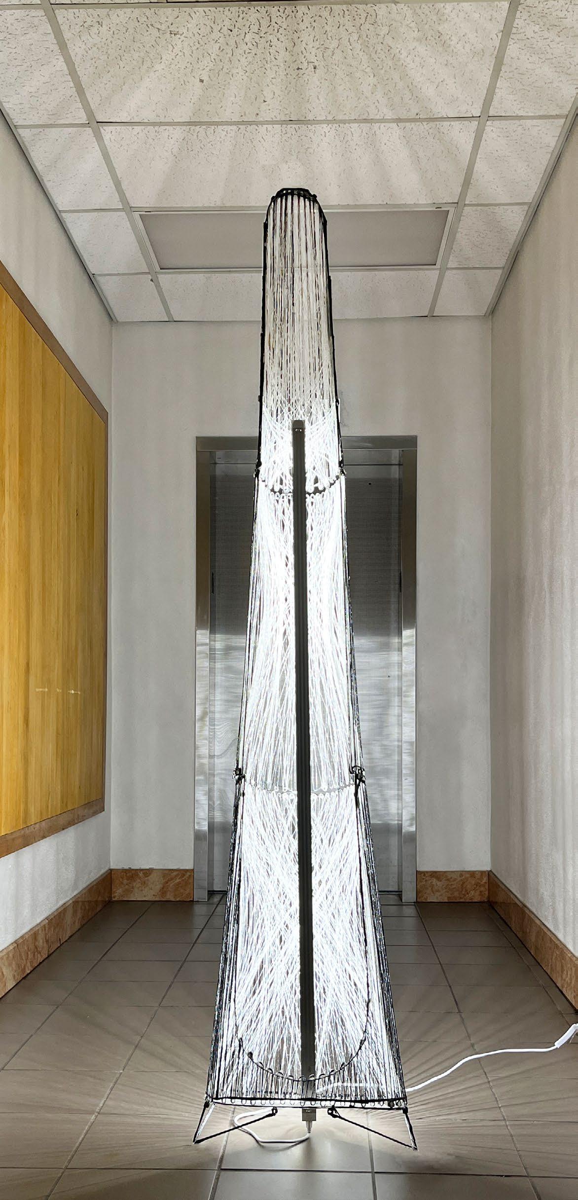 LOOMinaire is a 7 foot tall, doubly curved shell that is made of carbon and glass fiber tow.