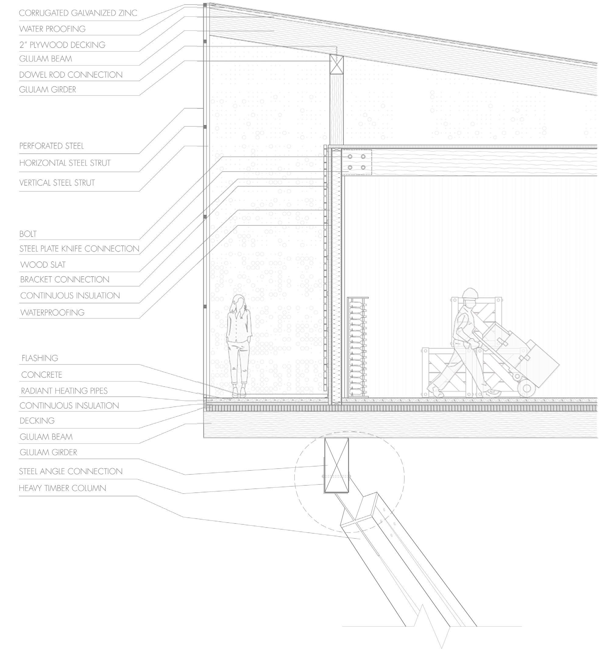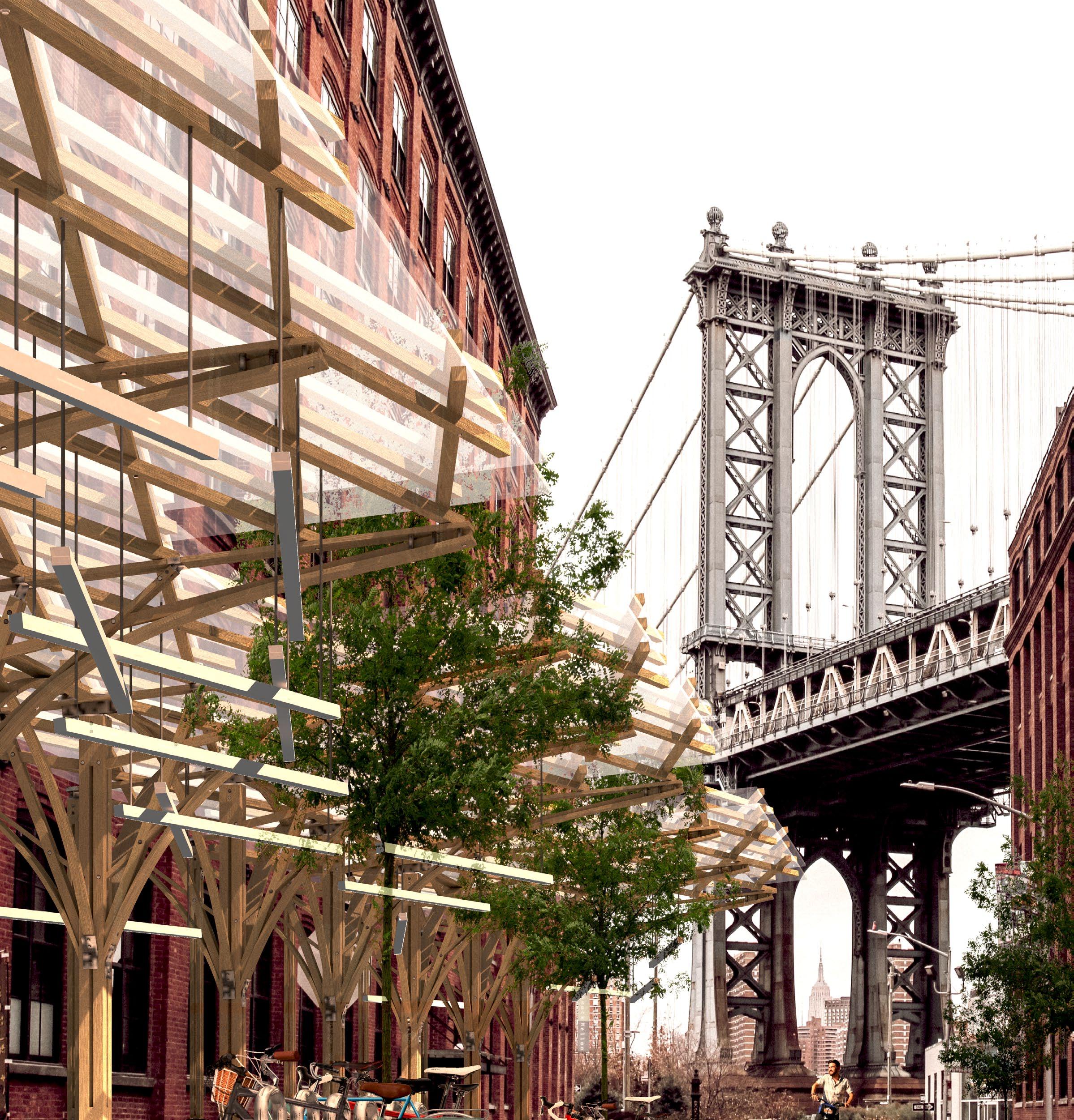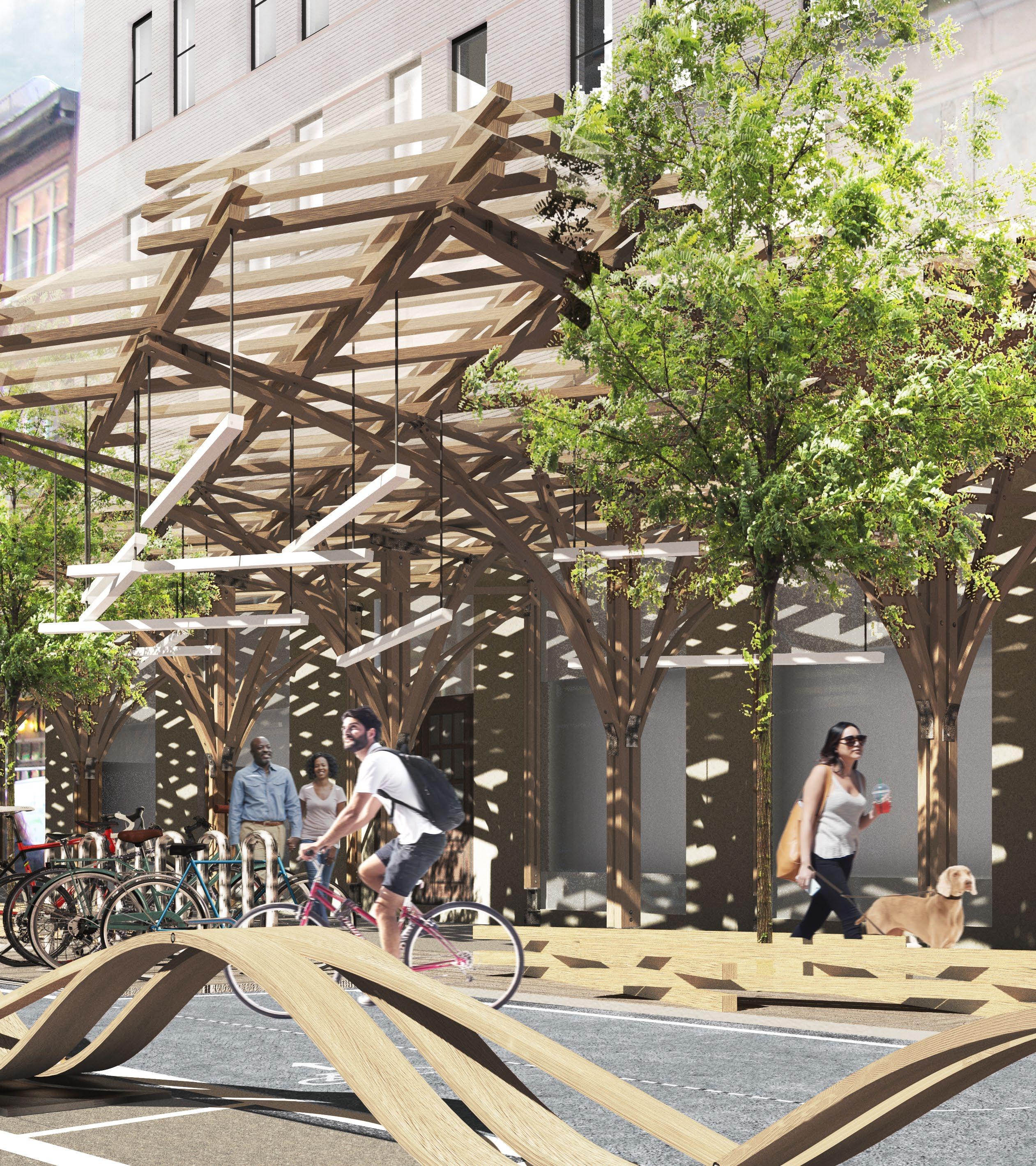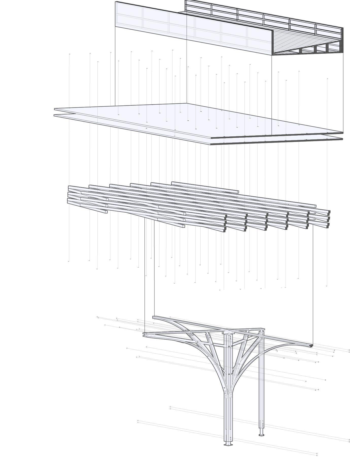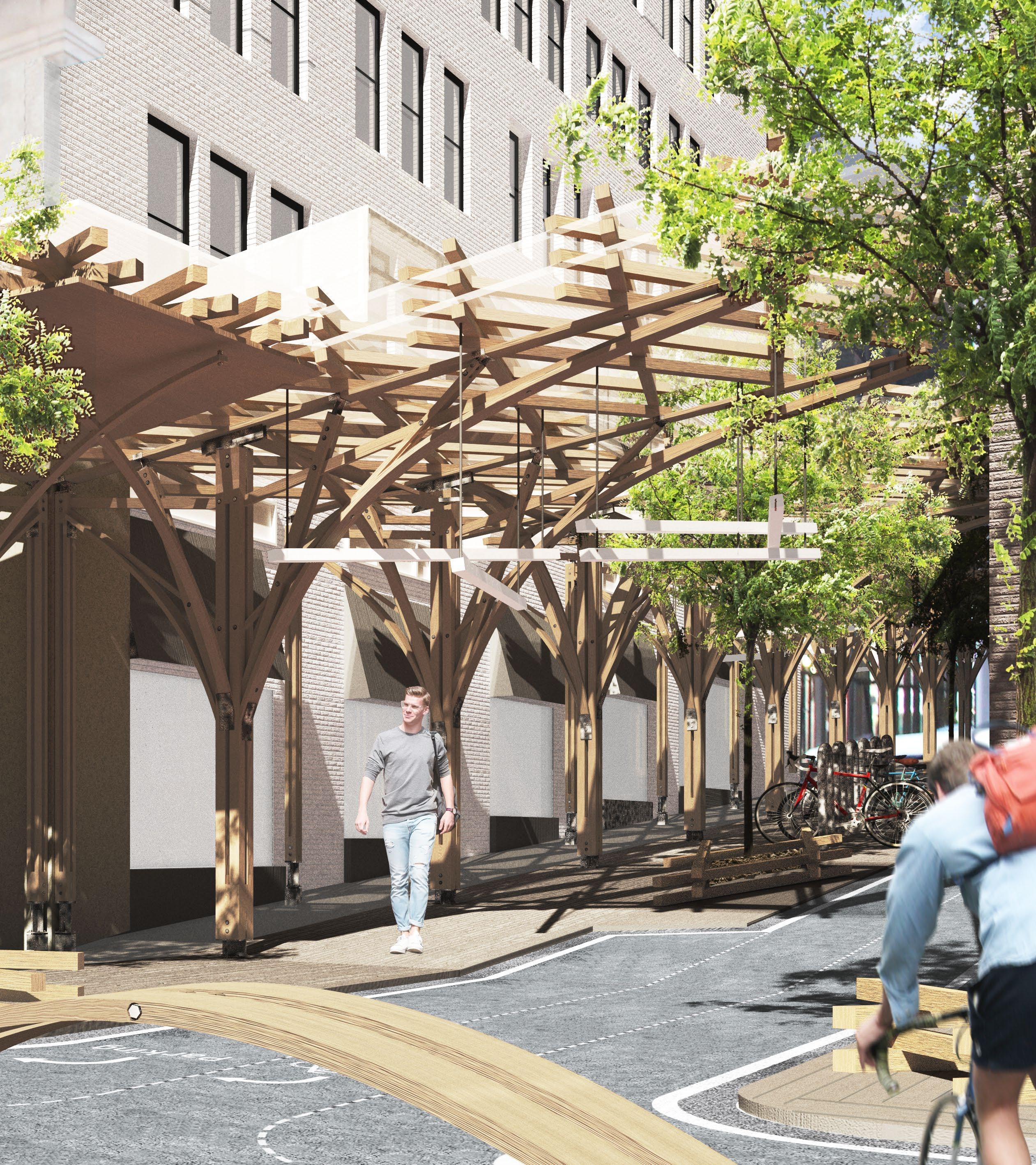 Bloom is a reimagination of what the infamous sidewalk shed could become when placed in the context of a 15-minute city. With these cities being primarily driven by the traffic of pedestrians and cyclists, it is of utmost importance to breathe life into the streets of these cities.