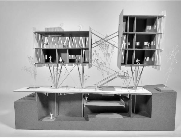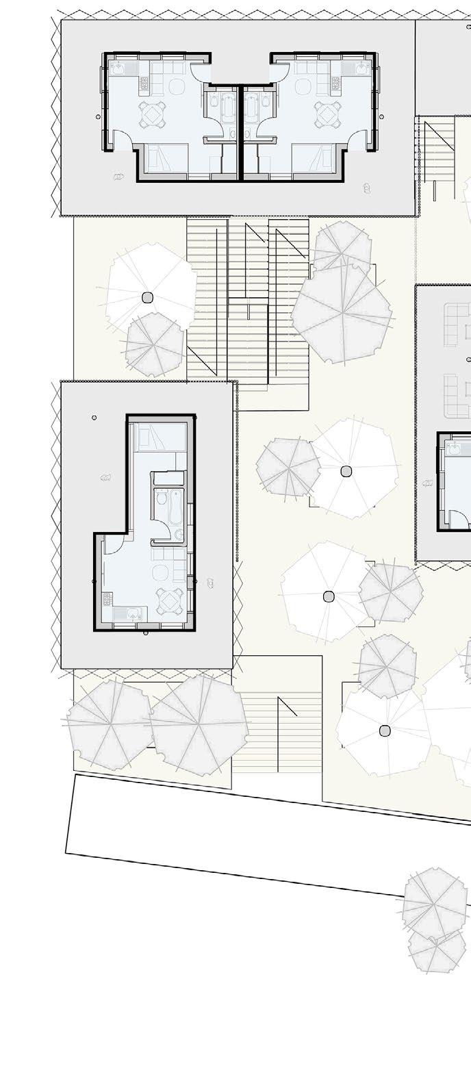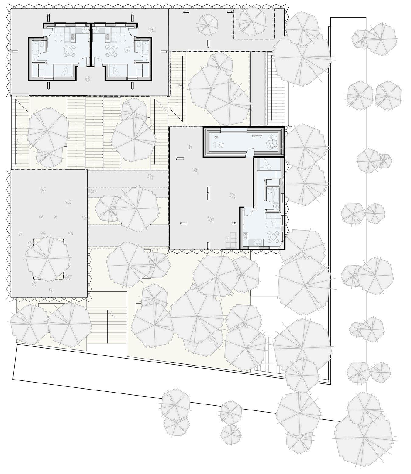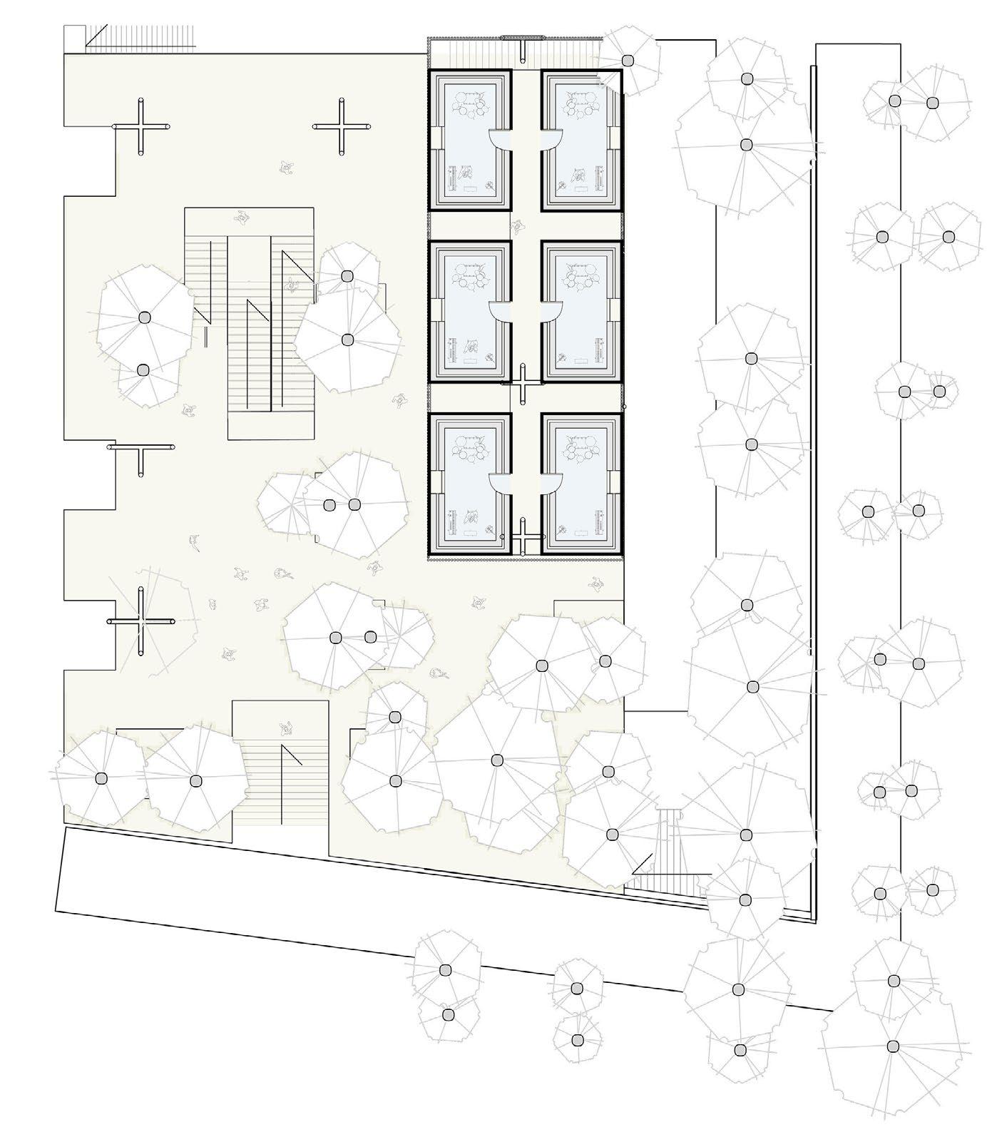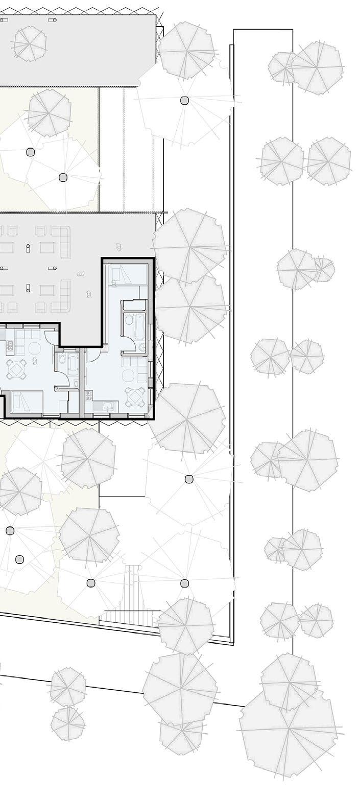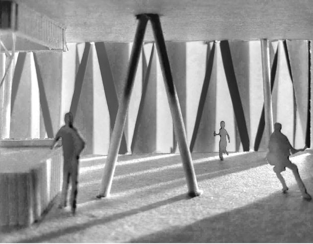 Unlike the dwelling spaces, the ground level serves as an open, semipublic "understory" that provides residents with an accessible outdoor space to congregate.