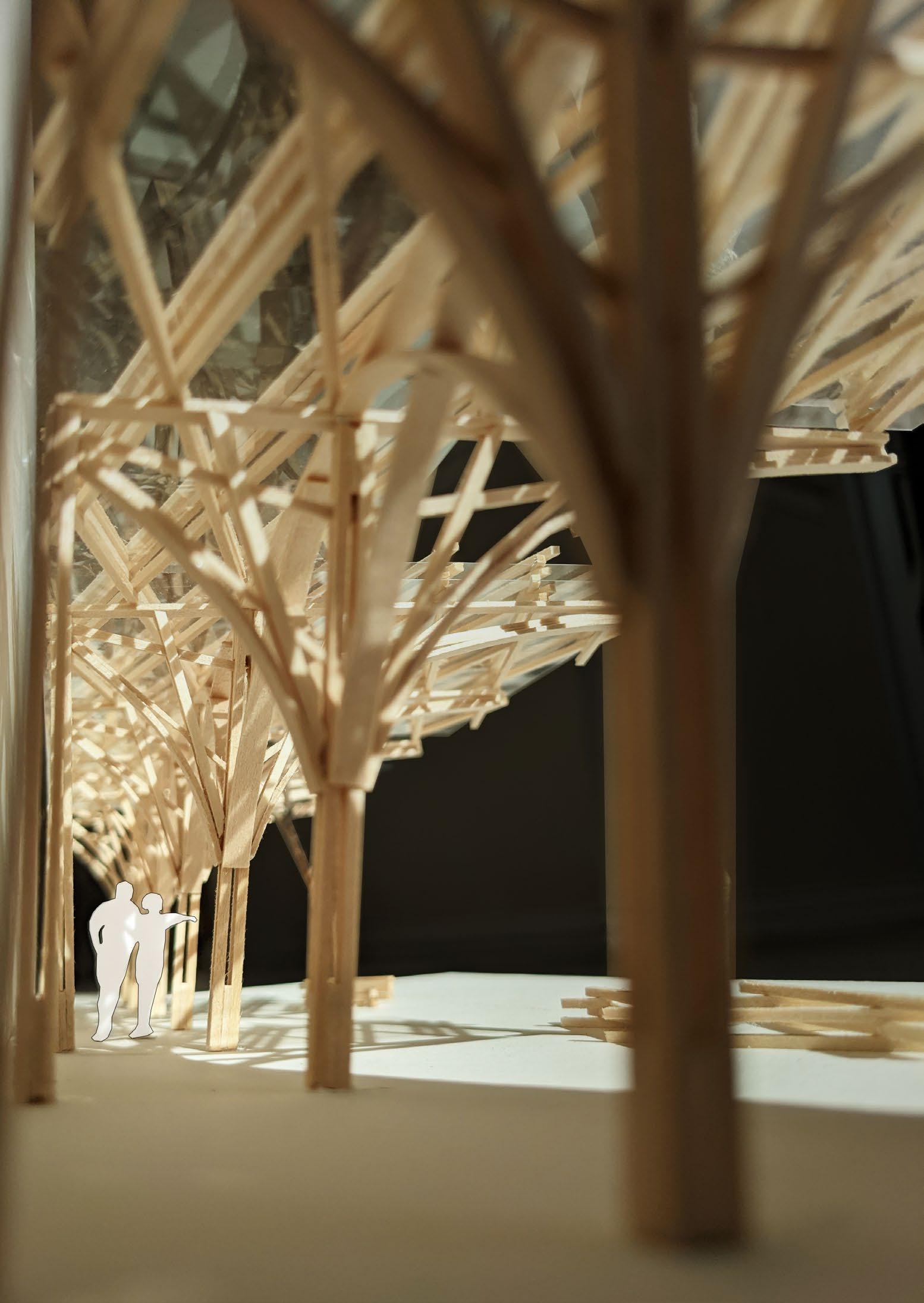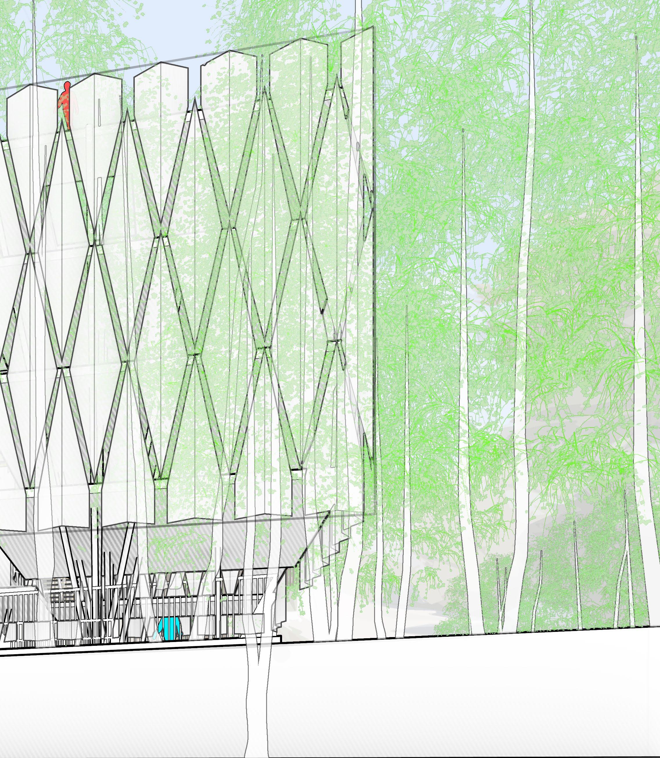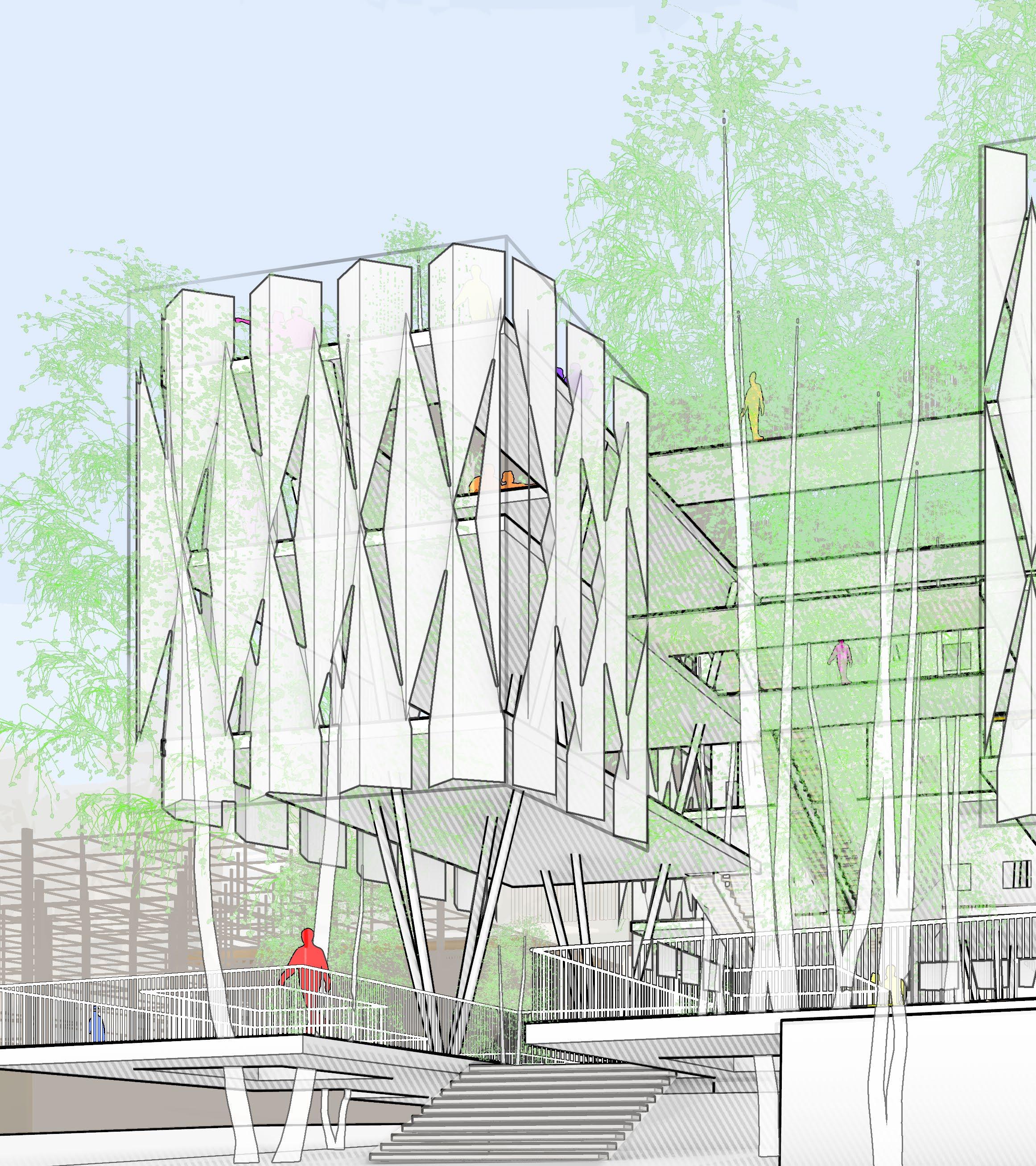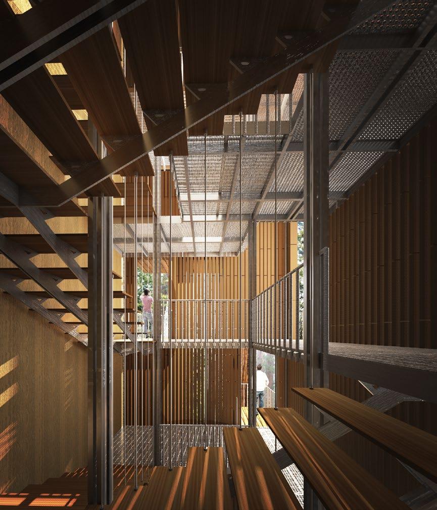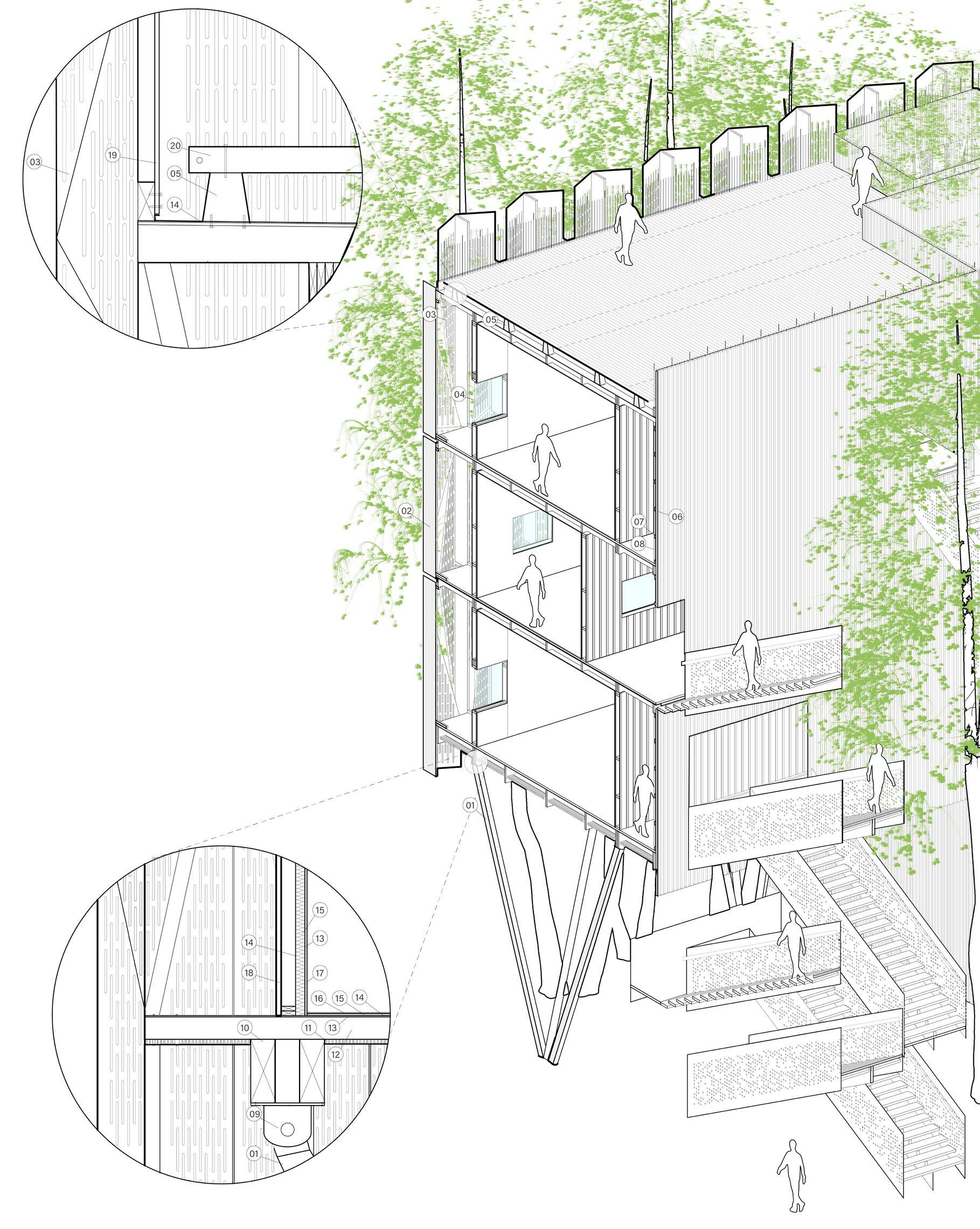 With each of the dwelling units being lifted off of the ground, occupants are granted the privacy that comes with raising the units away from the noisy streets. In addition to providing the visual and acoustic sensation of privacy, the height of the units also fully immmerses the occupants in the midst of the canopy.