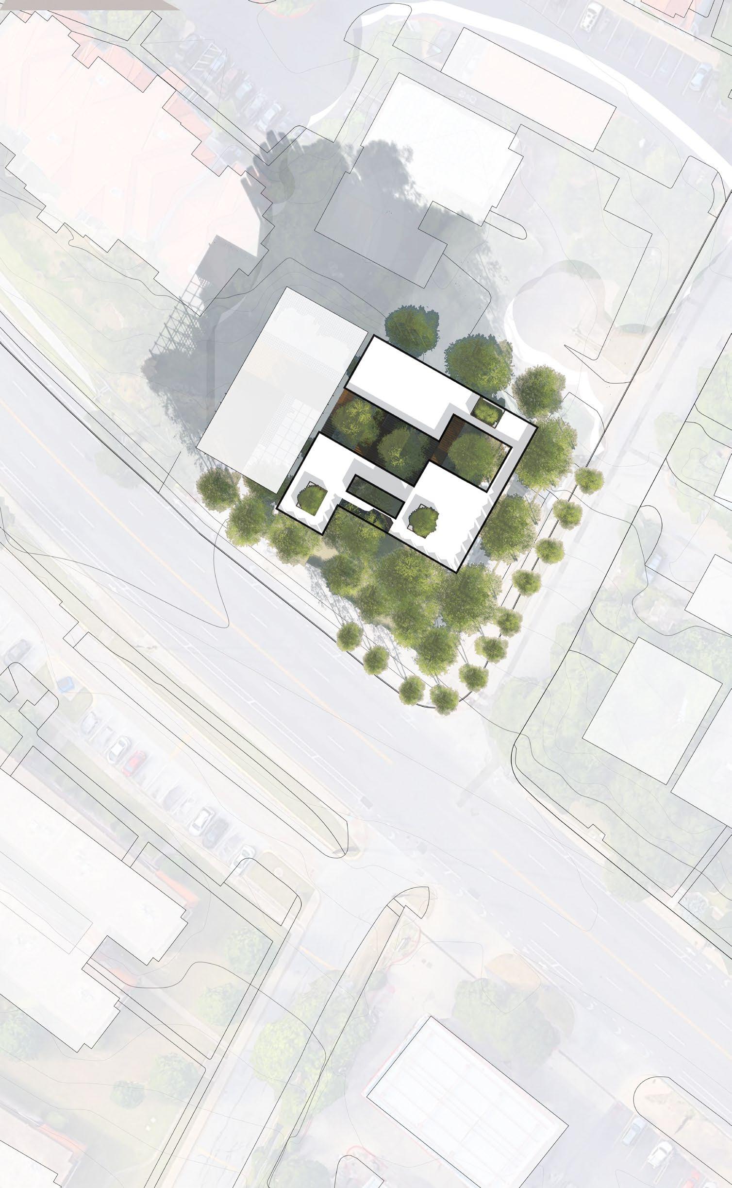 Sited on a previously barren corner lot, the Understory was designed to soften the edge between the residency and the two busy streets that wrap it. A veil of trees surrounds the perimeter of the property and bleeds into the interstitial space between the raised residential volumes.