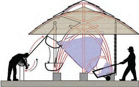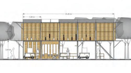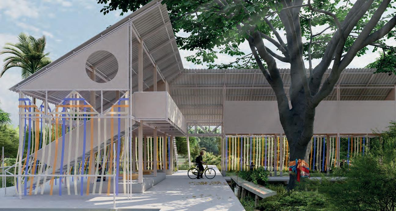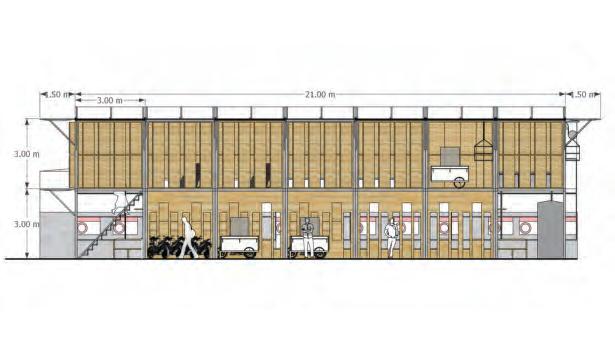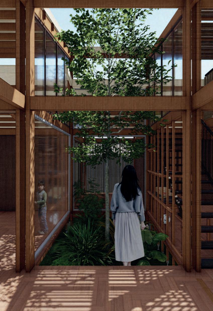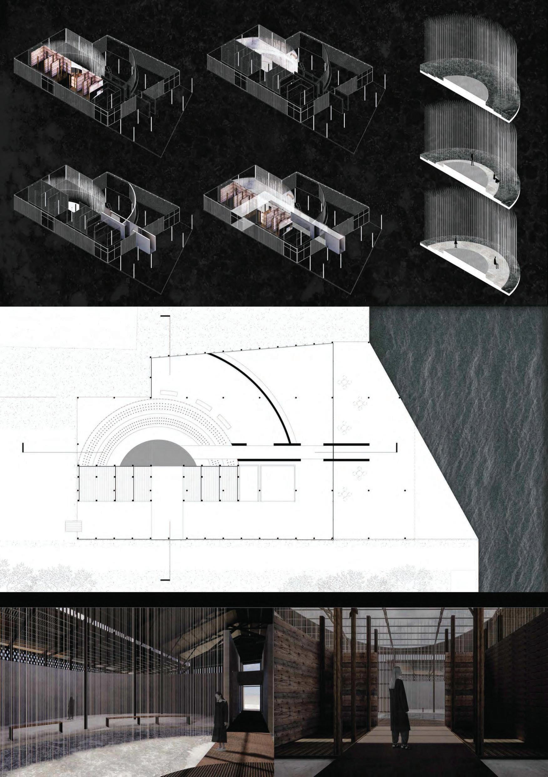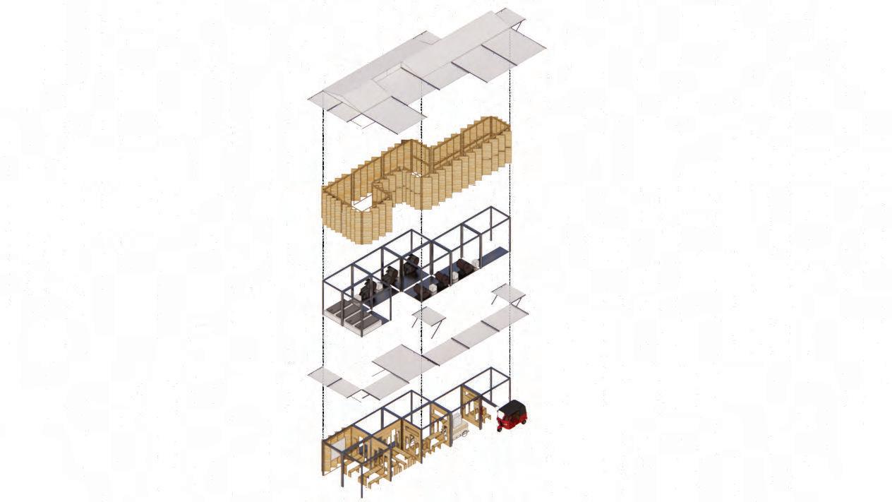 2. Setting Area: The area for collecting leaf scraps and silk droppings. 3. Grinding: The area for compacting leaf scraps and silk droppings to make fertilizer for sale and reuse in projects. At last, I have designed the building style with the surrounding environment in mind. In order to blend in with the mulberry garden and the surrounding village, a sense of place was created, from the scale of the building to the materials used in the design.