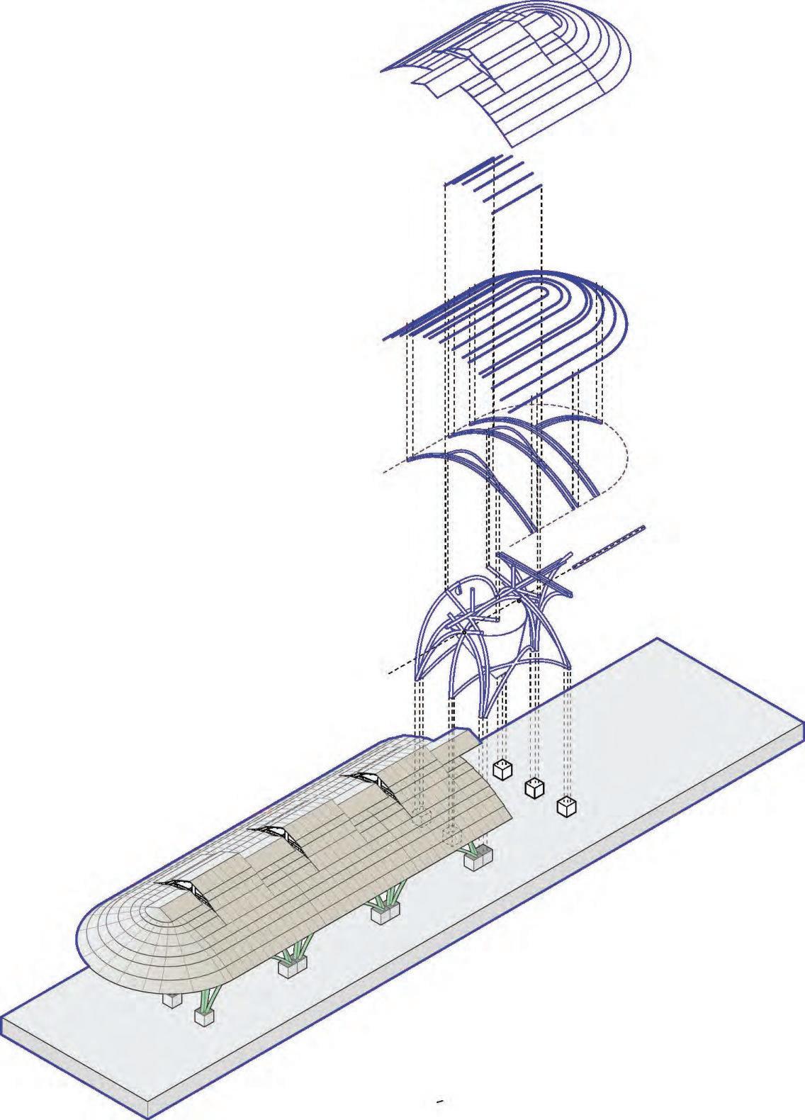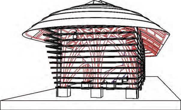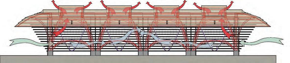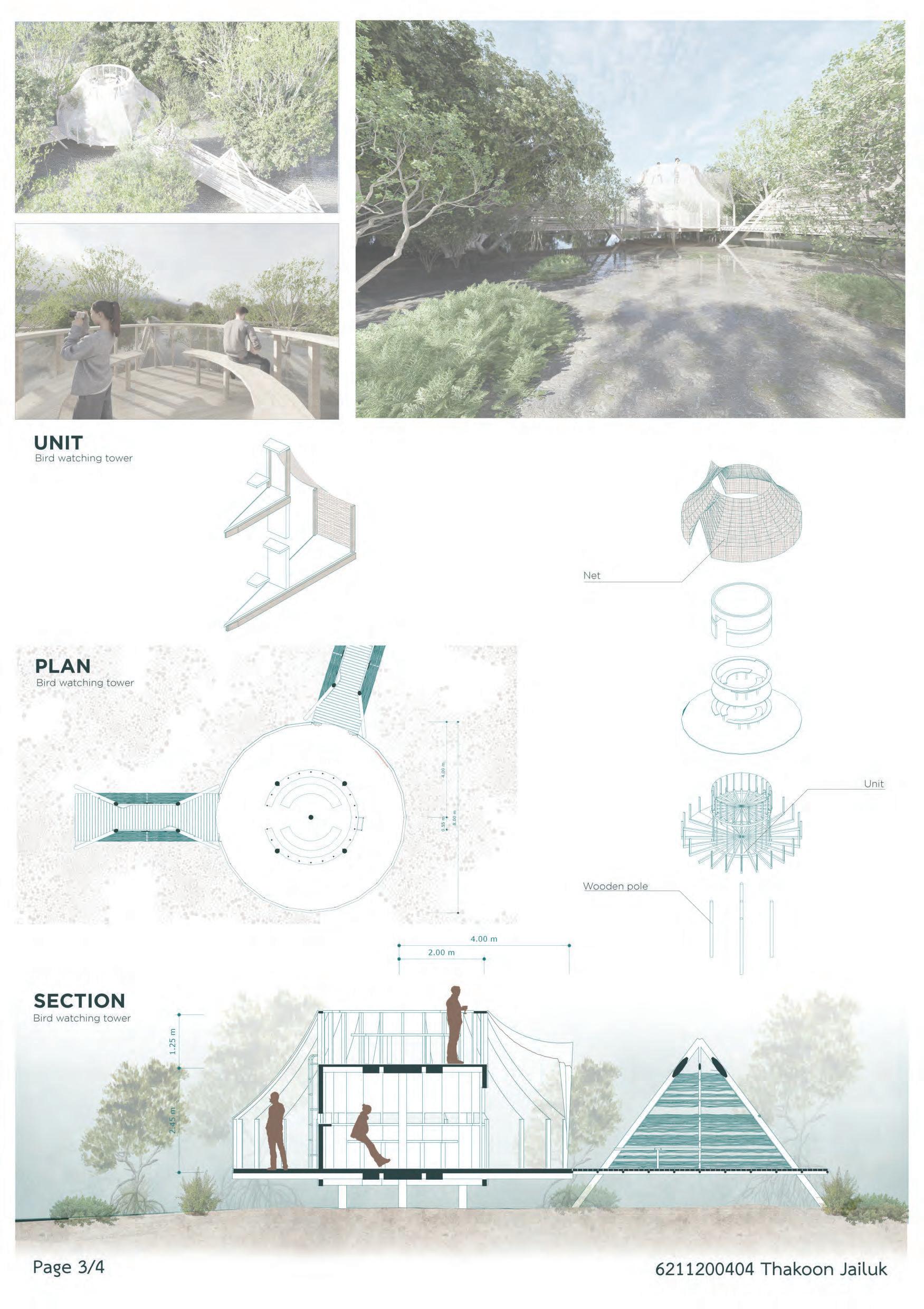 The aviary design idea is to contain Great Hornbills and Parrots in an artificial natural ecosystem and also to attach the main building, which serves as a maintenance building, exhibitions, breeding facilities, and bird-watching viewpoints for both inside and outside the aviary. The cageís main structure is a steel pipe that frames netting for the whole aviary. The material is lightweight and hollow, making the steel pipe safe for birds that accidentally fly towards it. Extend the aviary for birds to fly along the cage; leveling the pathway provides different views from above and under the trees.
