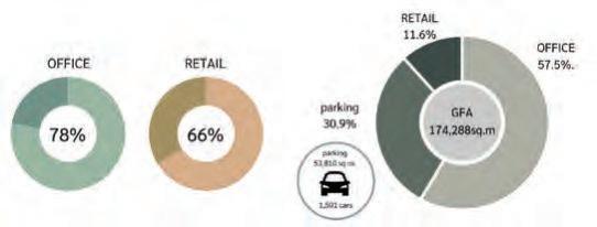 พื้นที่ขายแตละสวนจะถูกเชื่อมตอกันผานพื้นที่สีเขียว ขนาดใหญ ซึ่งแบงออกเปน 3 สวน ไดแก