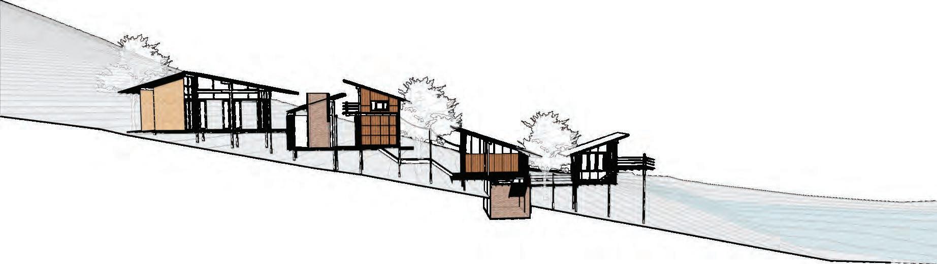 ตัวหองพัก แตละหองจัดวางมุมในองศาที่ใหความเปนสวนตัว และไดรับวิวมุมมองและสัมผัสใกลชิดกับ "ลำธาร" ไดมากที่สุดเชนกัน