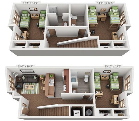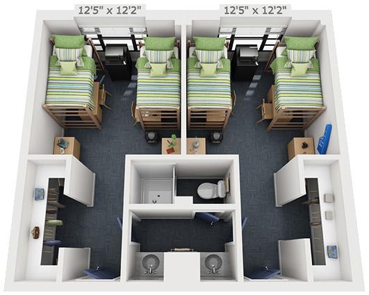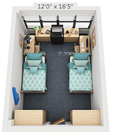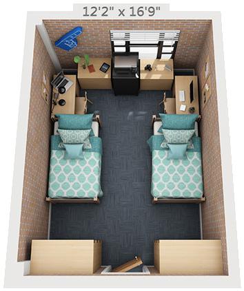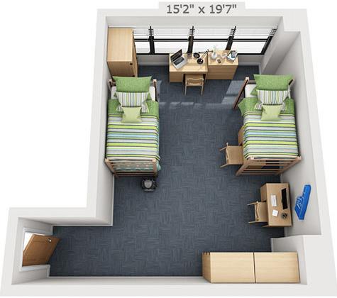 • Fully furnished with closets, desks, chairs, mounted shelves, chests of drawers and twin-XL beds, which are adaptable as bunk beds