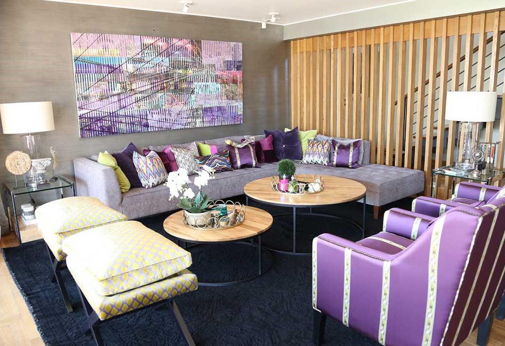 La primera jugada fue la distribución de los espacios, de lograr vivir un rincón desde el otro, desde más atrás, desde el lado, etc, la idea fue utilizar elementos que conectaran los espacios entre sí y no los separaran, es por esto uti lizaron artículos decorativos en gran formato, que fueran parte y visibles desde cualquier punto, ubicaron una TV en medio del living, a una cierta altura y distancia, logrando captar las miradas de todos los rincones.