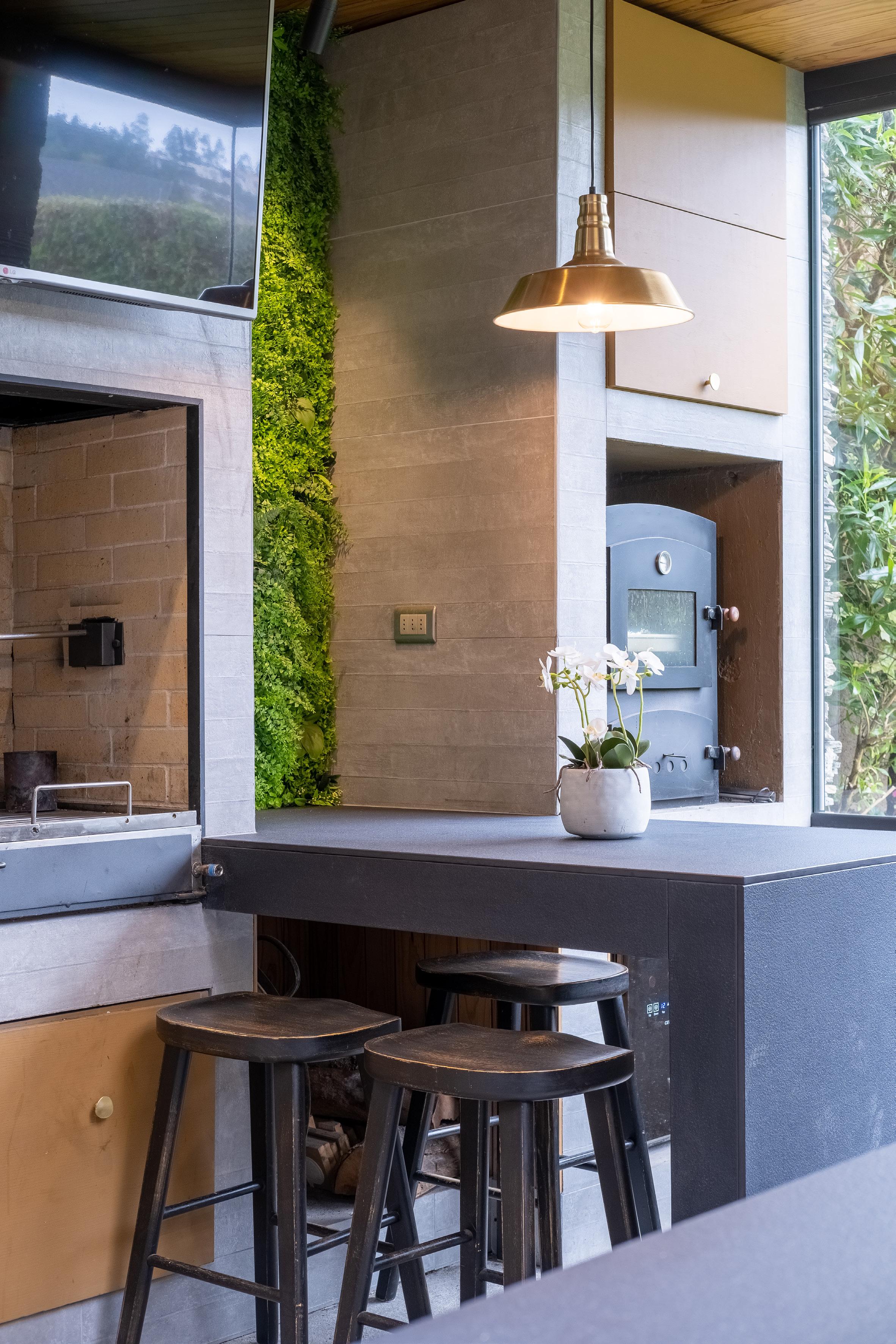 “Creamos espacios multifuncionales, trabajando con dos barras, de distintas alturas y tamaños, una pequeña, pen sando en compartir en pareja, para acompañar al parril lero o simplemente para crear un espacio más íntimo, con una luz más baja y focalizada, ubicándola en un sector más cercano a los puntos de calor y más pequeño. Mientras la otra, de mayor tamaño, la ubicamos en un espacio más ab ierto, que conecta con el patio y estar de terraza, donde la interacción se propone más libre y espontánea, puedes estar ahí sentado, parado o de pasada simplemente para dejar tu vaso”, comenta la diseñadora.