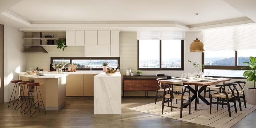 “Lo que más nos enamoró de la elección de materiales, fue el color que logramos en la pintura para los frentes de mue bles, un tono ocre que encendió el espacio en su totalidad, amarró perfectamente la madera, la tonalización de la pie dra y el resto de los materiales. Y como siempre, nuestro sello que nunca falla, el dorado, en pequeños acentos que hace a este espacio brillar”, finaliza.