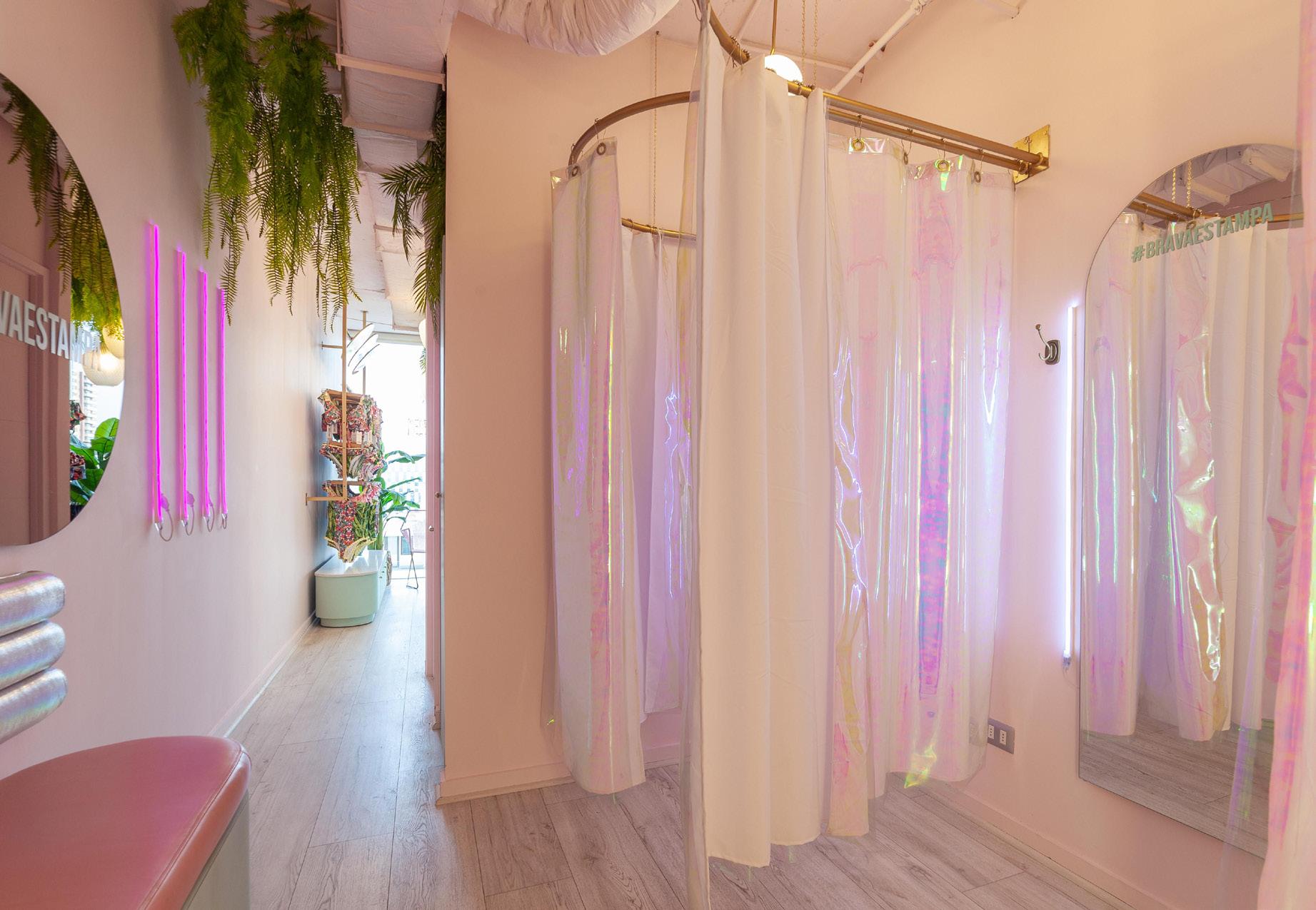Utilizando este concepto crearon un espacio de mucha simetría, elegante, con líneas curvas, acentos con luces de neón, brillos y una paleta de colores pasteles muy concreta.