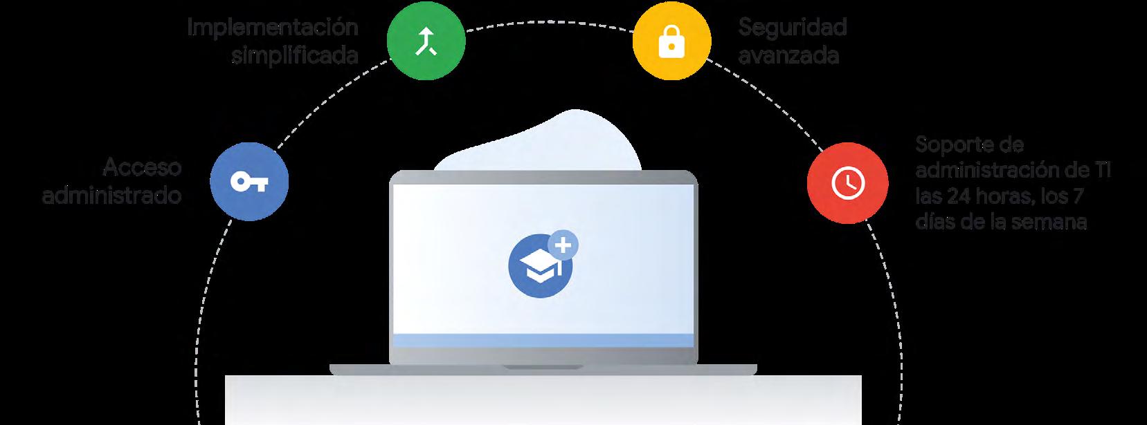 Dispositivos. Chromebook, Chromebox y Chrome OS Flex. Plataforma de Google, unidades organizativas y gestión de identidades. Asesoramientos y gestión de licencias Google Workspace for Education. MDM, seguridad y control parental. Garantías y seguros.
