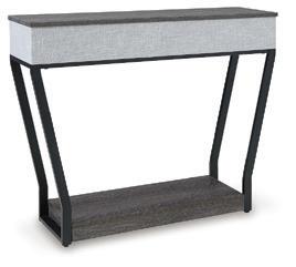 Accent table. Constructed of solid and engineered wood, glass and metal in black and polyester fabric in gray. Glass top with wireless charging and touch button controls. 6.5” full range speaker and 2” tweeter speaker. Wireless connection, FM antenna, aux in hook up and USB charging port.