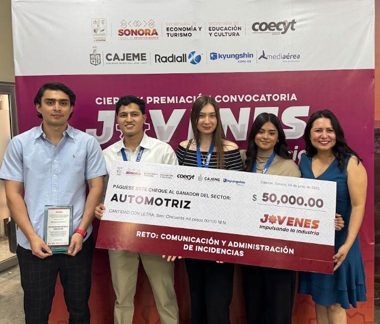 Entre 55 anteproyectos, 42 equipos y más de 160 jóvenes, los futuros ingenieros de La Salle Noroeste lograron alcanzar la etapa final de los tres retos, de igual número de empresas, de la Convocatoria “Jóvenes Impulsando la Industria” en su edición 2025, que tuvo lugar del 10 marzo al 5 de junio, que el Gobierno de Sonora y el Consejo Estatal de Ciencia y Tecnología (COECYT) impulsan para conectar a la academia con el sector productivo. En dos de los tres retos resultamos ganadores del primer lugar. Primeramente, en la empresa Radiall Obregón, del sector Aeroespacial, con el equipo integrado por estudiantes de mecatrónica Eric Eduardo Lizárraga, Diego Josué Urrea, Gilberto Yomar Díaz, con el reto: Optimización de espacio y tiempo de surtido de almacén. Por otro lado, en la empresa Kyungshin México, del sector Automotriz, con el equipo integrado por estudiantes de Industrial en Calidad Jorge Antonio Estrada, Karel Yanin Moroyoqui, Ana Amelia Velázquez, con el reto: Comunicación y administración de incidencias.