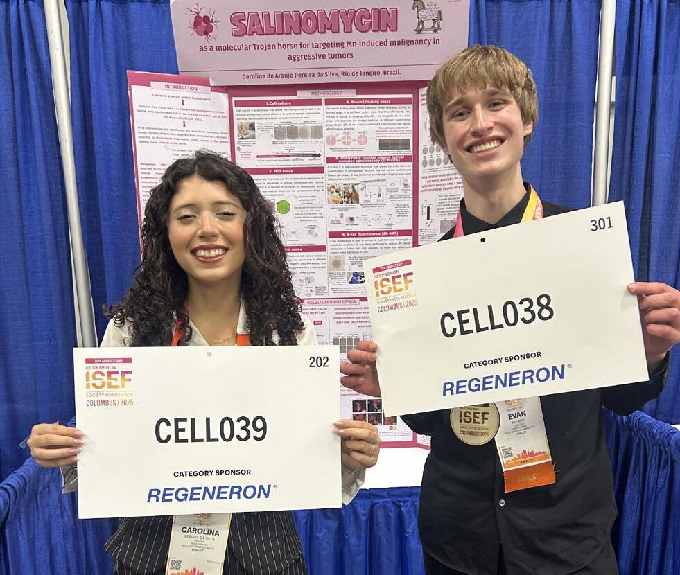 POSING PROUDLY. Senior Evan Morris stands with a friend holding their project IDs. Morris attended the International Science Fair in May 2025. “I was fortunate enough to win second [place] there in cellular and molecular biology,” he said.
