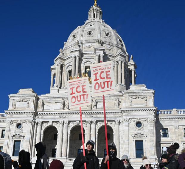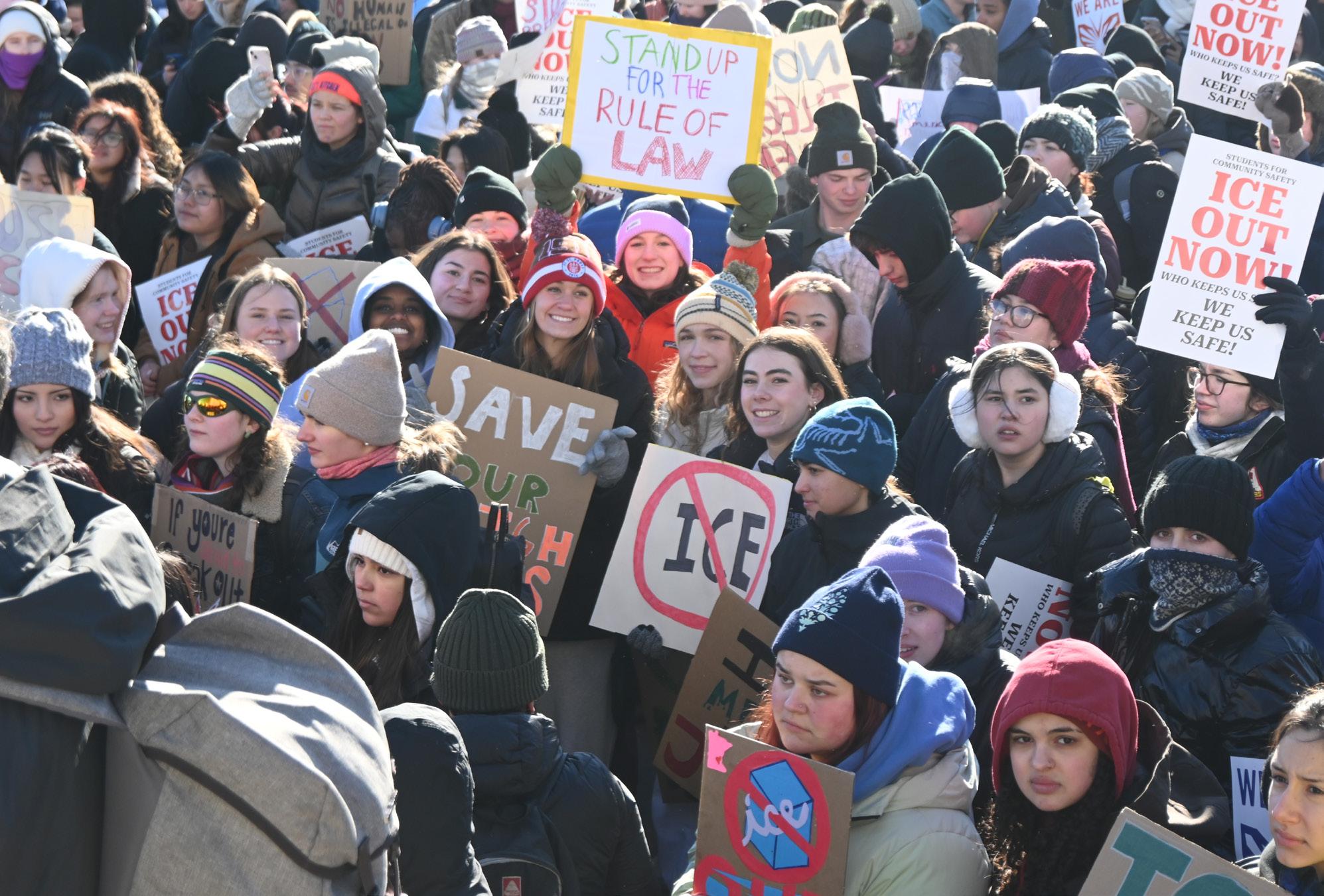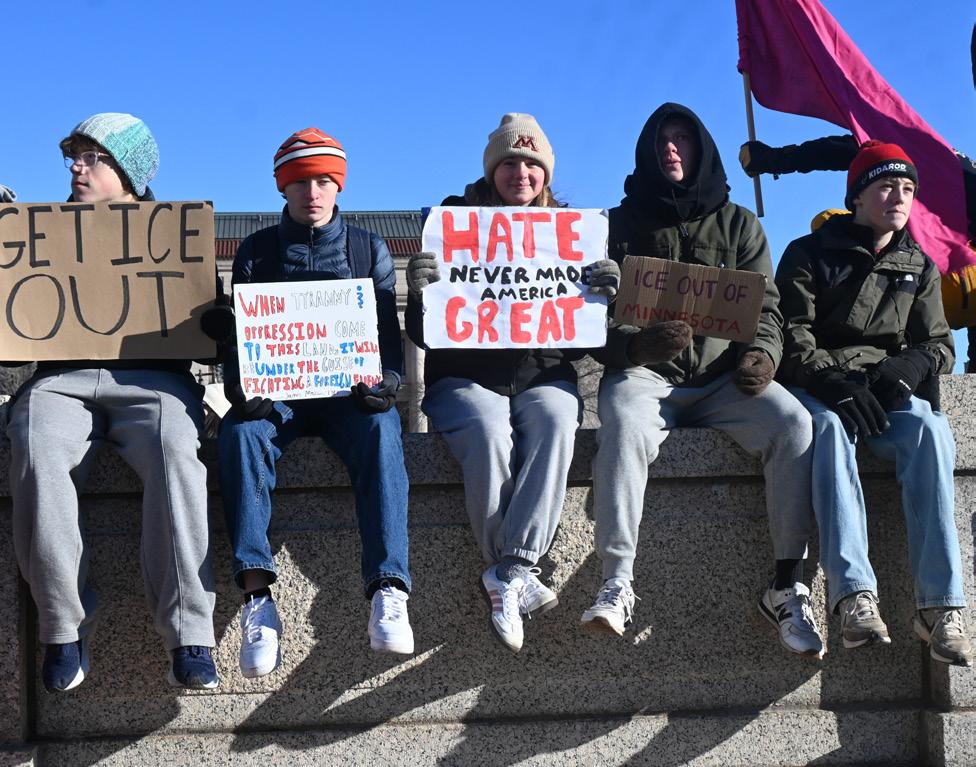 STUDENTS STAND UP. Students peacefully congregate at the Minnesota Capitol on Jan. 14 in their warmest winter apparel, expressing their opposition against U.S. Immigration and Customs Enforcement. The protest was student-led and attracted students from all over St. Paul. Junior Eli Perry commented on ICE's presence: “It is a dystopian reality … I feel like a lot of people are treating it as normal ... but it’s not. This is not normal,” he said.
