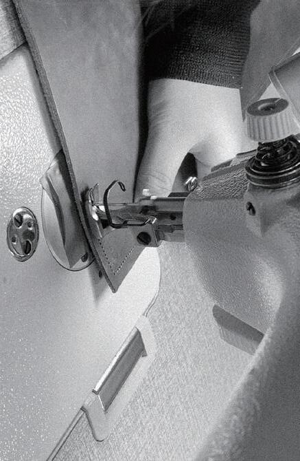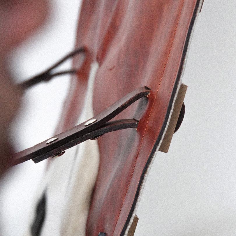 選材上大膽的使用真皮皮革與布料的結合,將原本適用在包款的材質 套用在家具上。皮革表面與生俱來的細膩,面對布料獨特的肌理有著 強烈的對比。異材質的撞擊,給予了「~」全新的視覺以及觸覺感受。