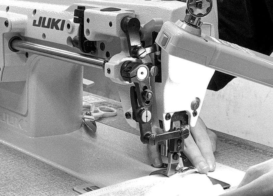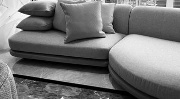 選材上大膽的使用真皮皮革與布料的結合,將原本適用在包款的材質 套用在家具上。皮革表面與生俱來的細膩,面對布料獨特的肌理有著 強烈的對比。異材質的撞擊,給予了「~」全新的視覺以及觸覺感受。