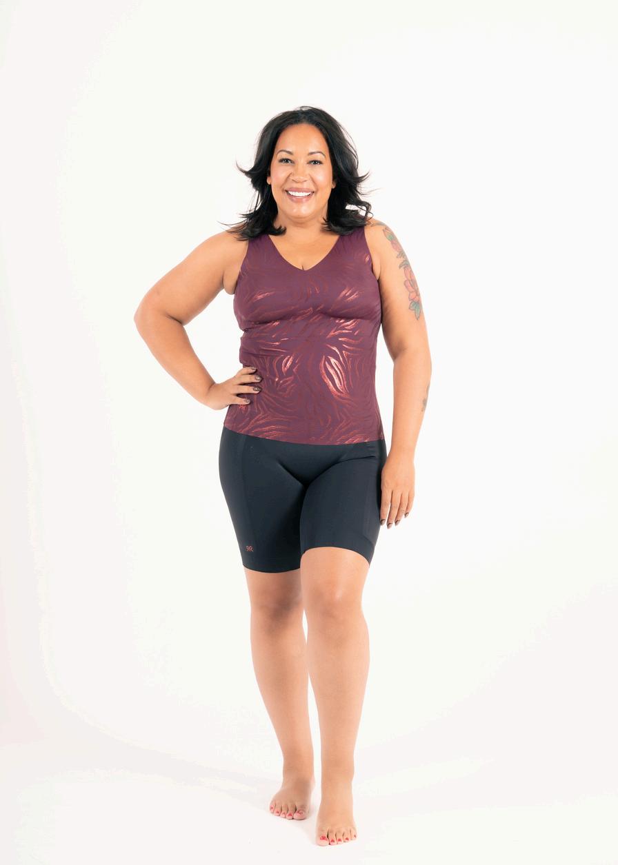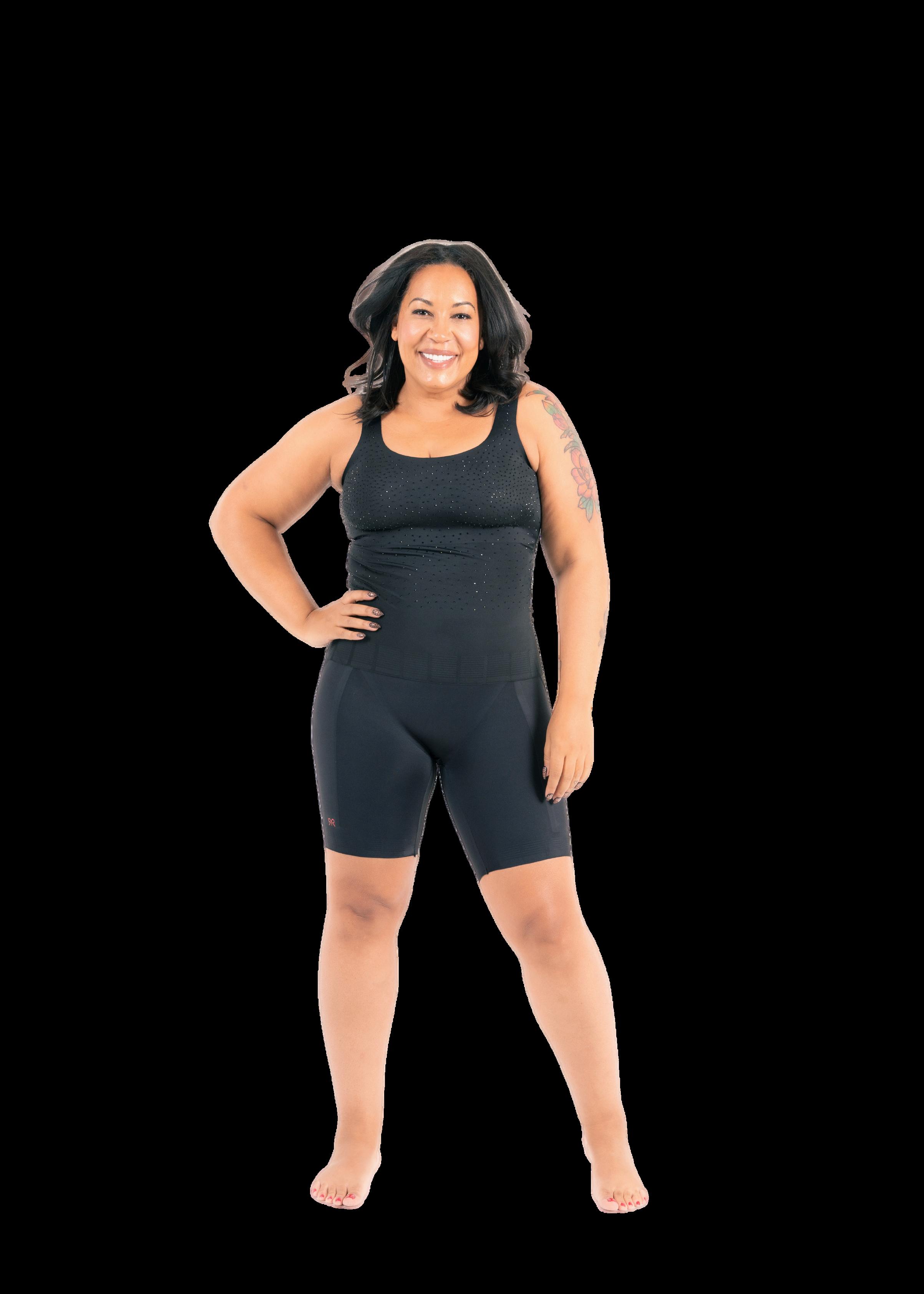 Style the Embellished Sleek Shape Tank with classic black for a pop of sparkle. Kat is a 36D with a 42" hip wearing size 36 Cami.
