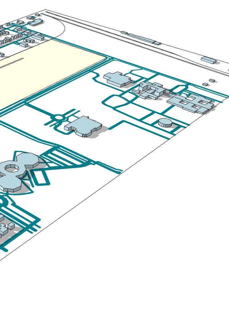 The future projected functionality of the site is multifamily housing along with startup office spaces. Both of the functions would require good amount of connectivity from other parts of Urbana and Champaign for its success rates. The design emphasizes transit-oriented development (TOD) principles to create a pedestrian-friendly, well-integrated urban space. It incorporates a central road network connecting residential and commercial zones, supported by strategically placed bus stops and plazas for improved accessibility. The diagonal grid of roads help in connecting maximum stretch than just horizontally placed roads. It also creates intersections which would help in reducing speed of vehicles. The plaza spaces can act a public space for congregation as well functionally for waiting spaces for bus stops. By prioritizing public transportation, the design aims to reduce car dependency, thereby contributing to lower greenhouse gas emissions and promoting a more sustainable urban lifestyle.