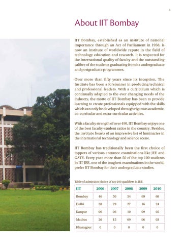 About IIT Bombay IIT Bombay, established as an institute of national importance through an Act of Parliament in 1958, is now an institute of worldwide repute in the field of technology education and research. It is respected for the international quality of faculty and the outstanding calibre of the students graduating from its undergraduate and postgraduate programmes. Over more than fifty years since its inception, The Institute has been a forerunner in producing technical and professional leaders. With a curriculum which is continually adapted to the ever changing needs of the industry, the motto of IIT Bombay has been to provide learning to create professionals equipped with the skills which can only be developed through rigorous academic, co-curricular and extra-curricular activities. With a faculty strength of over 490, IIT Bombay enjoys one of the best faculty-student ratios in the country. Besides, the institute boasts of an impressive list of luminaries in the international technology and science scene. IIT Bombay has traditionally been the first choice of toppers of various entrance examinations like JEE and GATE. Every year, more than 50 of the top 100 students in IIT JEE, one of the toughest examinations in the world, prefer IIT Bombay for their undergraduate studies.