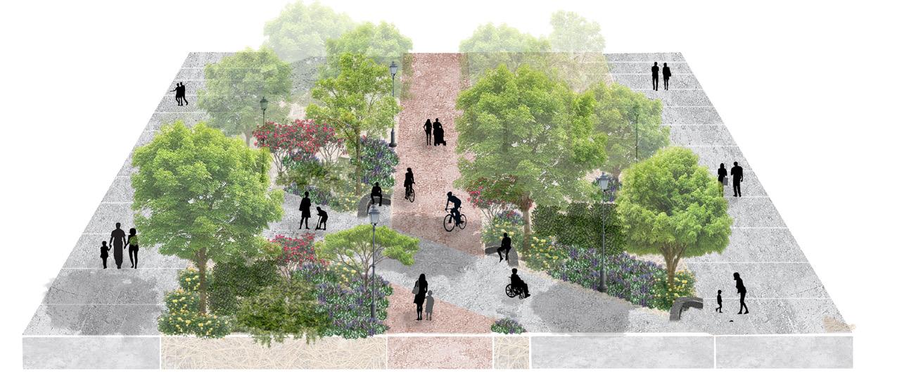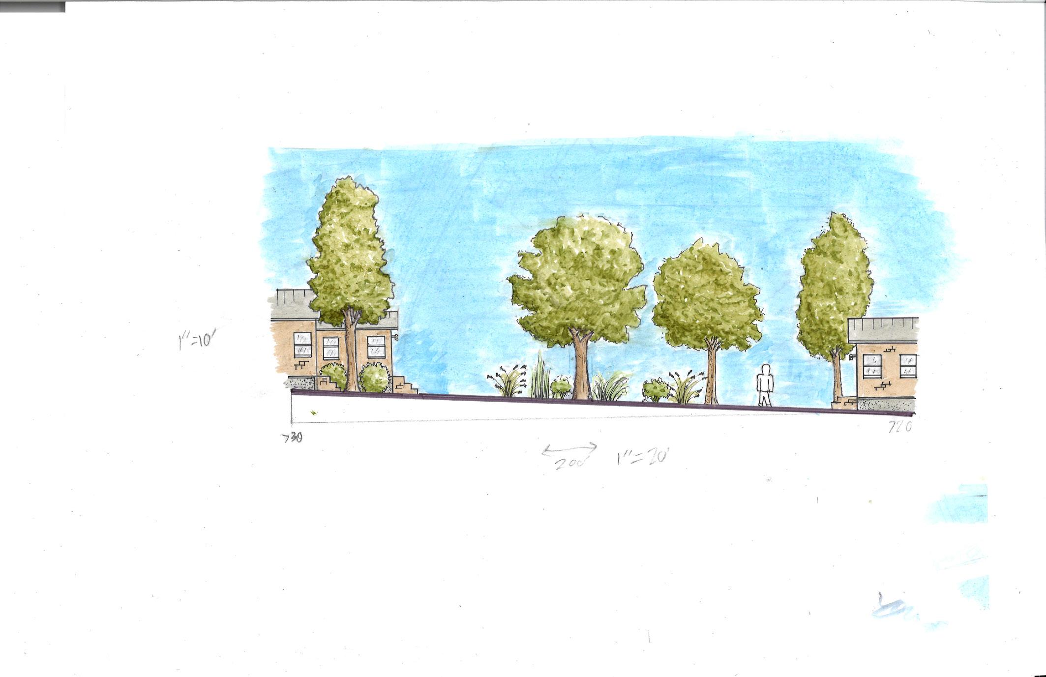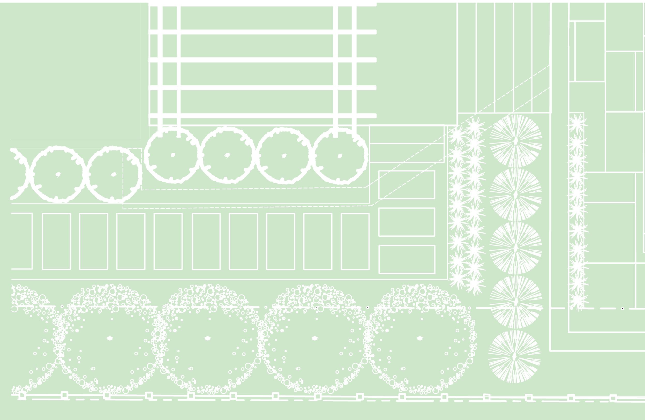 Developing a community shared greenspace, digitally rendered plan, CAD planting plan, section elevation.
