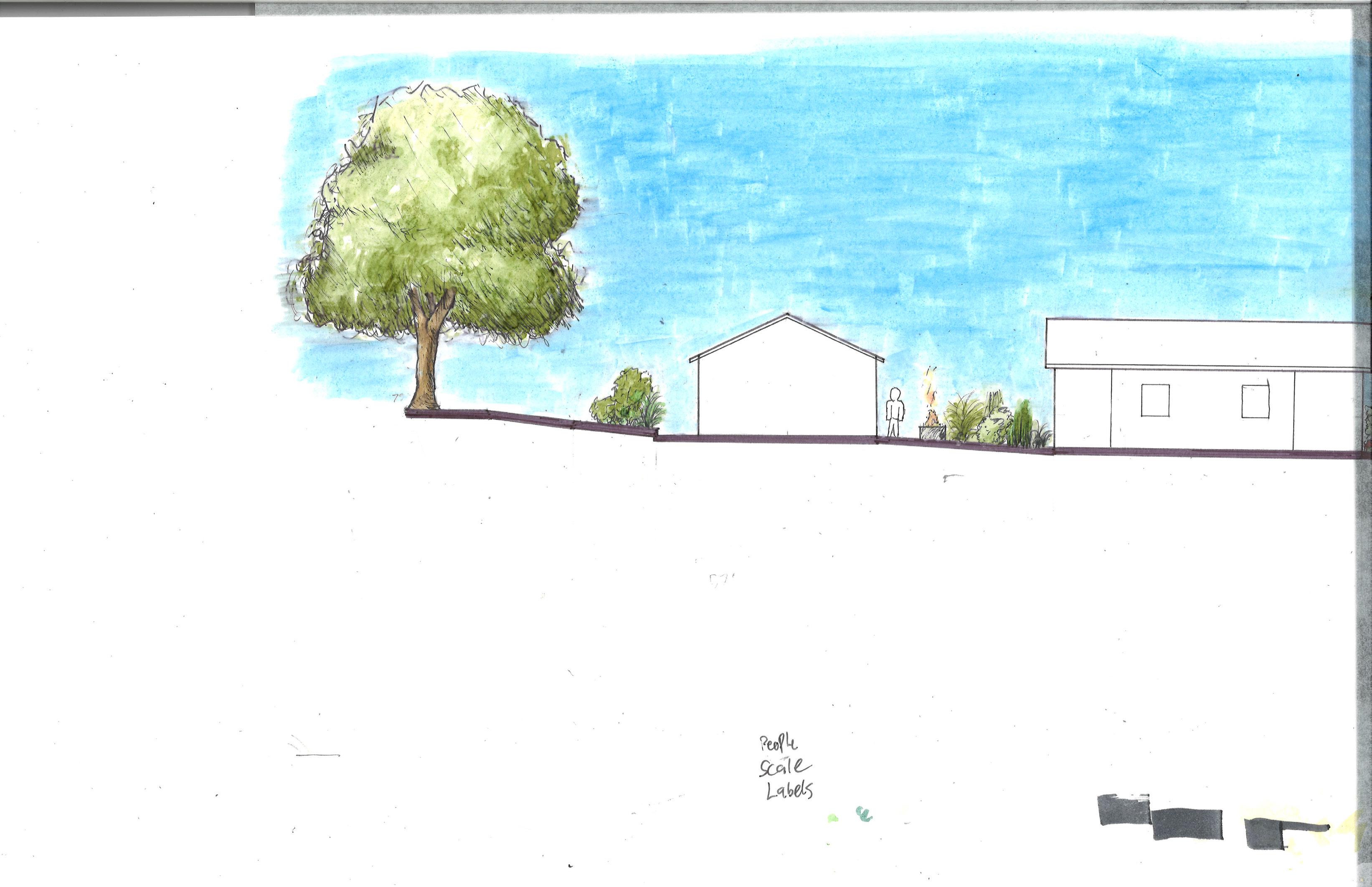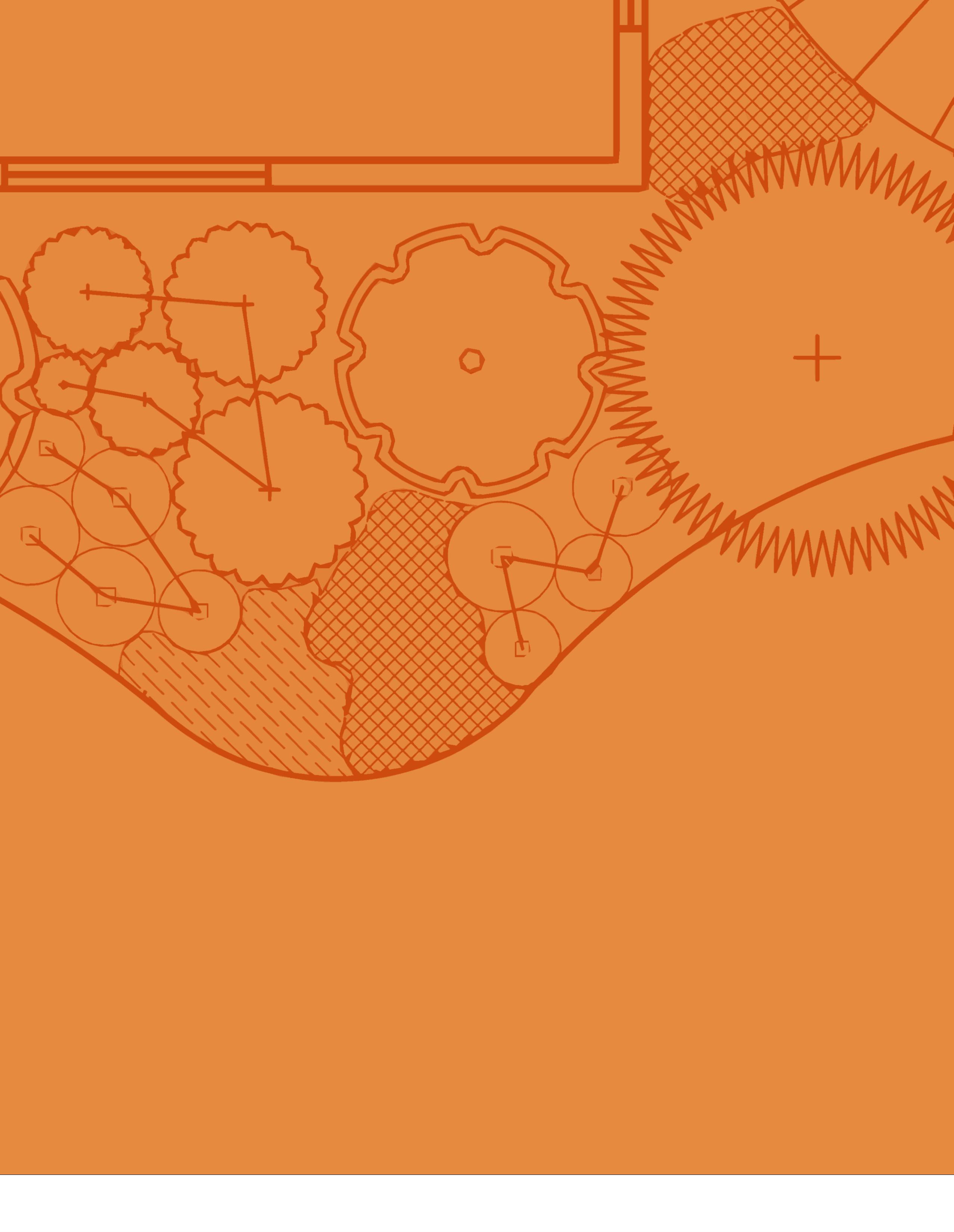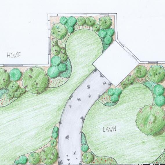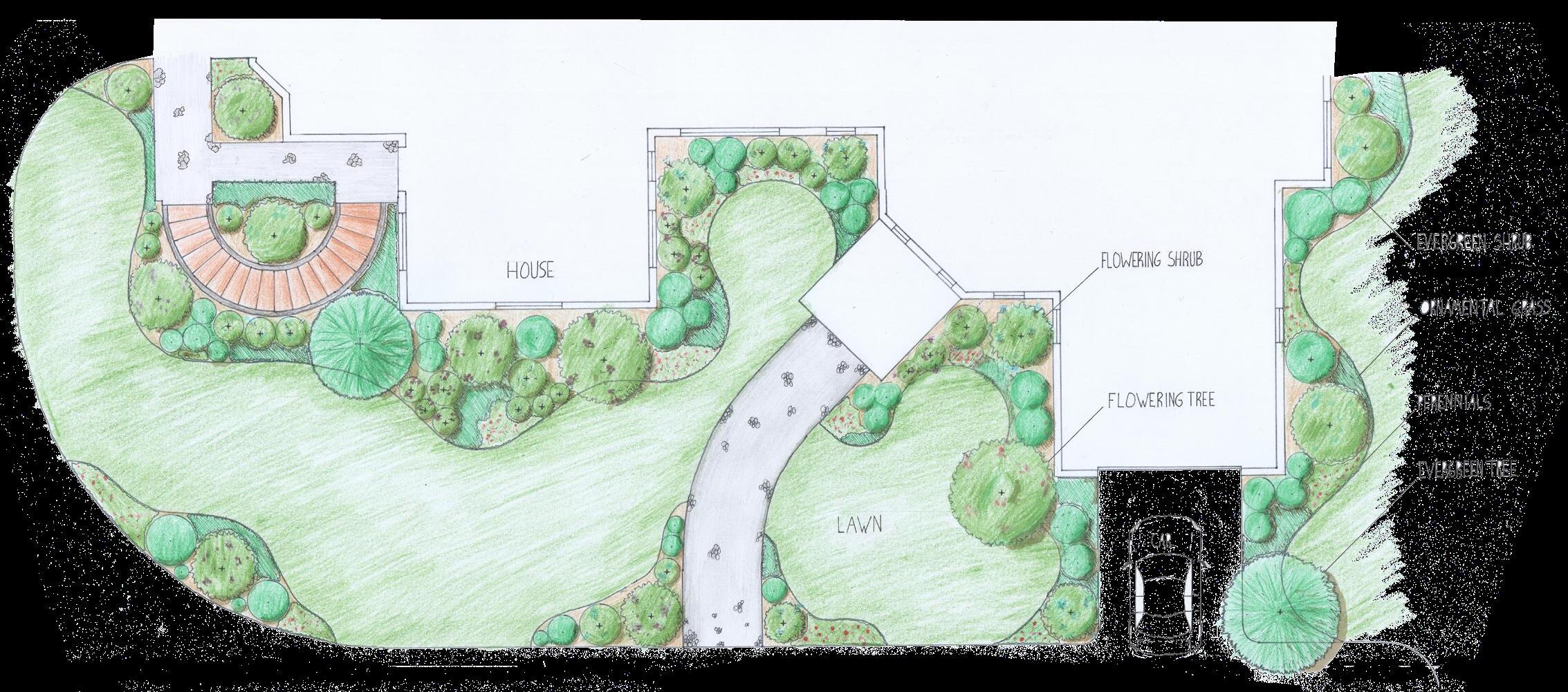 Residential planting design, hand rendered plan, digitally rendered plan, CAD planting plan, sketches, section elevation.