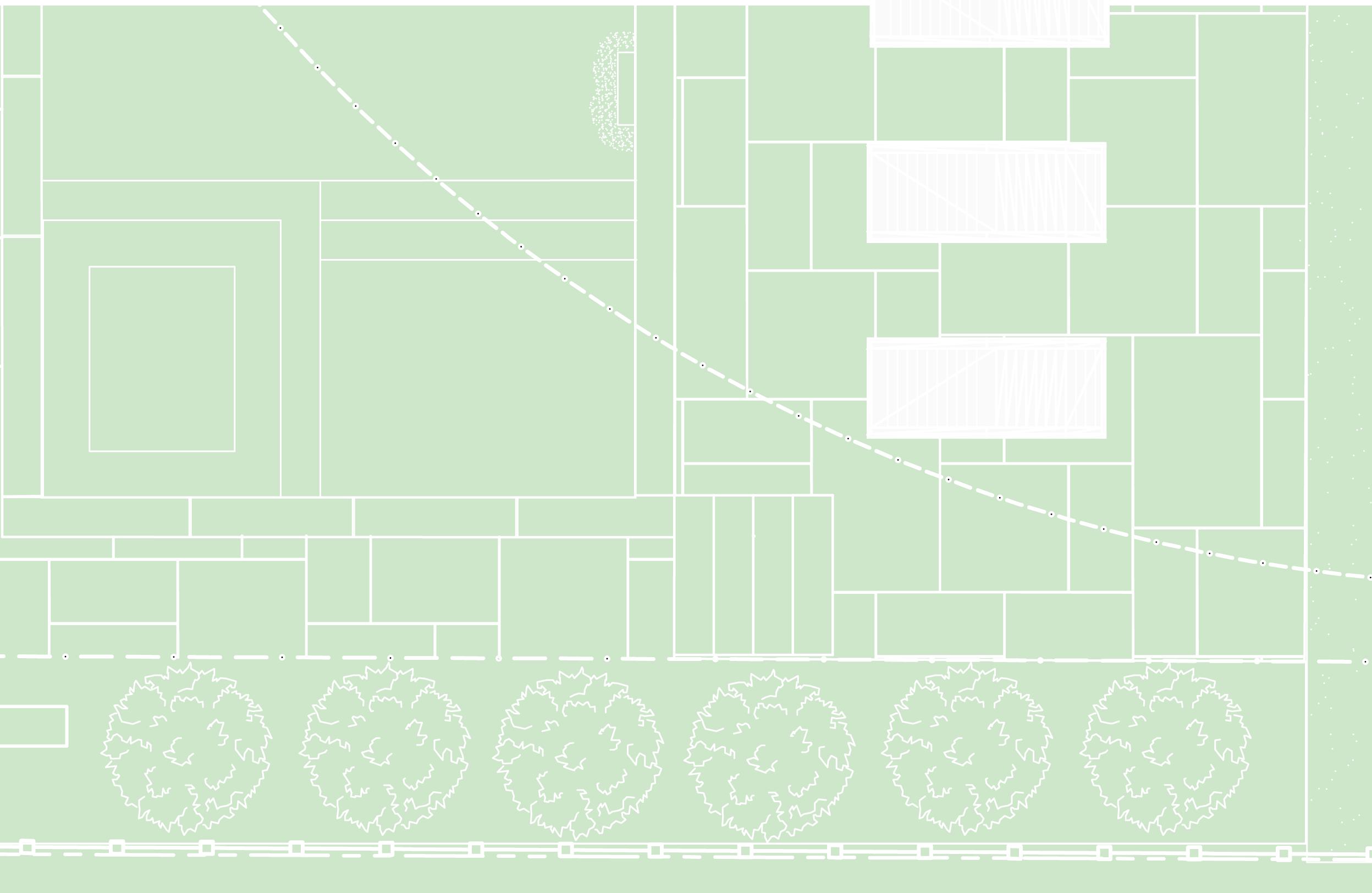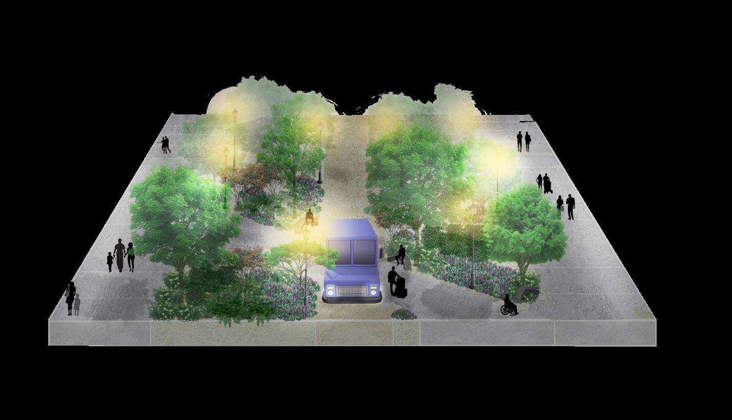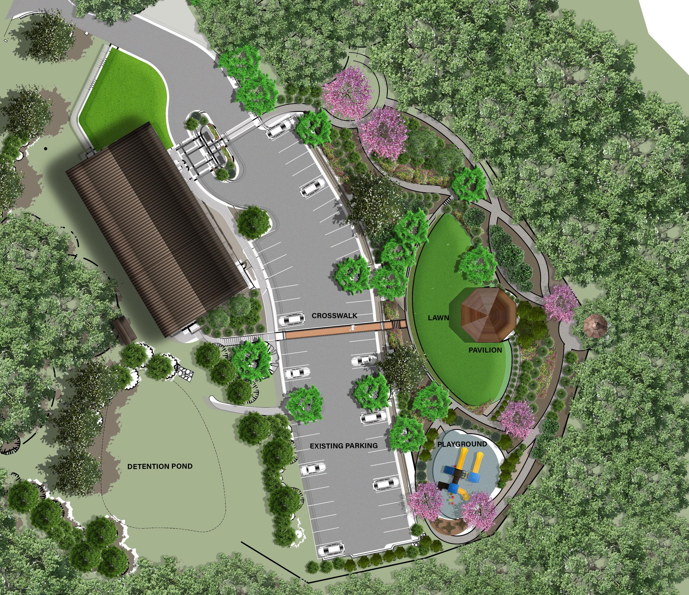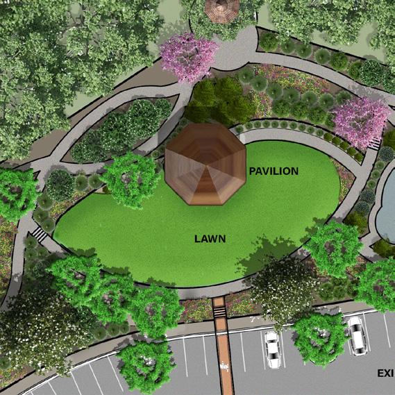 to be installed between the ajacent paths. A planting buffer is installed between the main lawn and parking lot to provide a soft barrier separating the two. The pavilion on the lawn is the main attraction, having sitelines to the playground and lawn space.