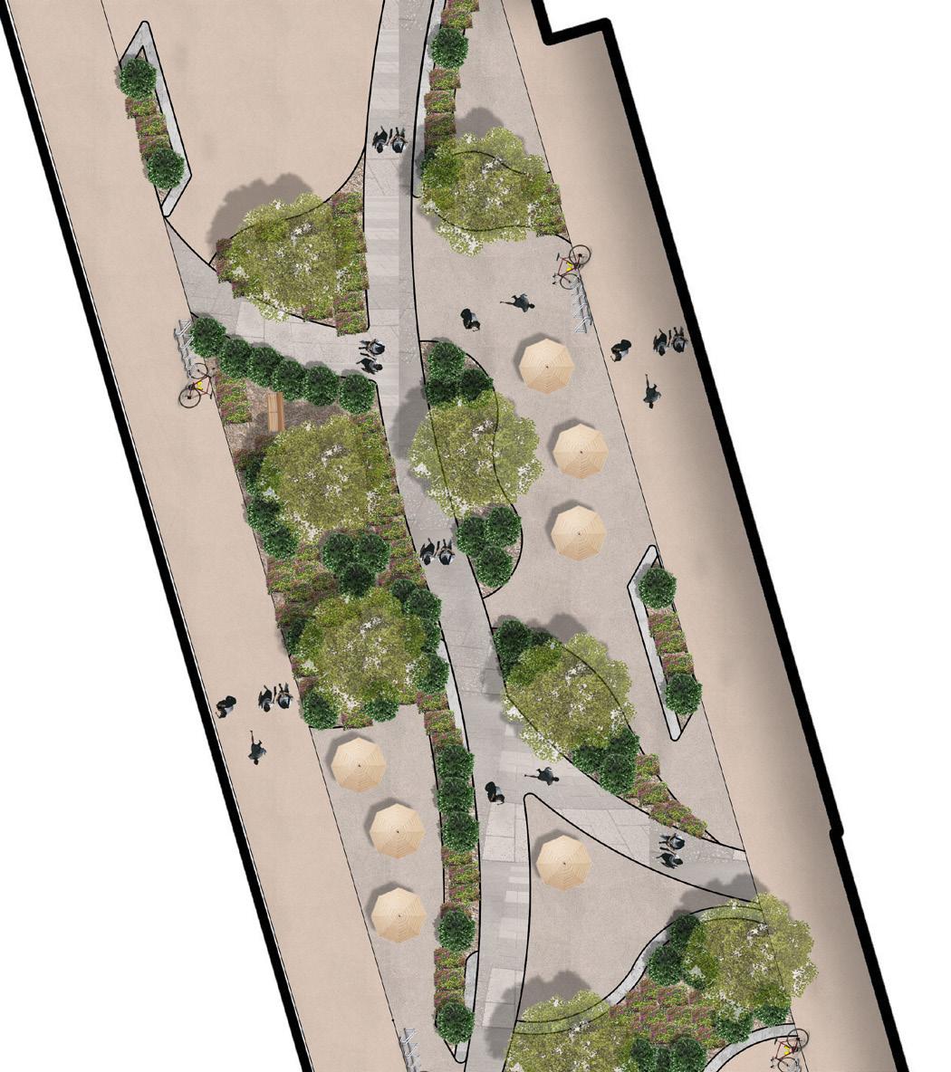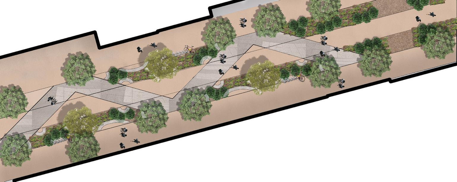 A central 12’ wide utility lane runs through the site allowing a space for deliveries, emergency vehicles, and trash trucks. During most hours the lane will be utilized by pedestrians.