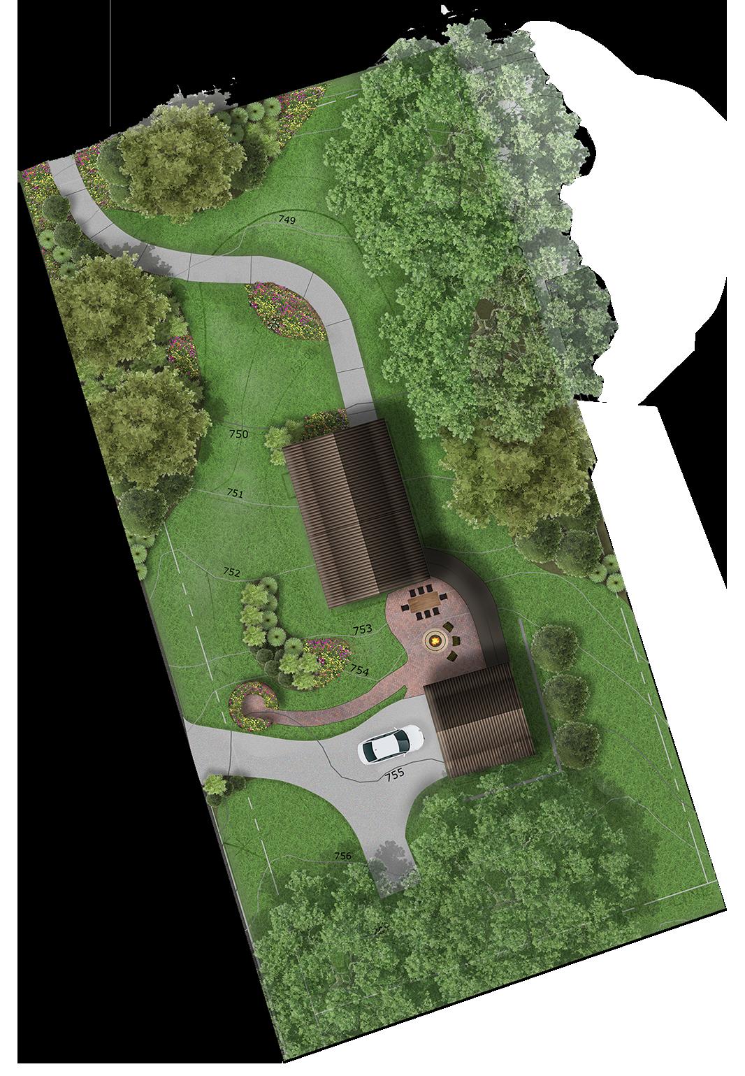 The main design to the east of the site is situated on a hill so creating a flat lawn area through retaining walls was a top priority. This design utilizes curvilinear walking paths on the east side of the site to provide a relaxing and interesting walk. The weaving paths create space for plantings