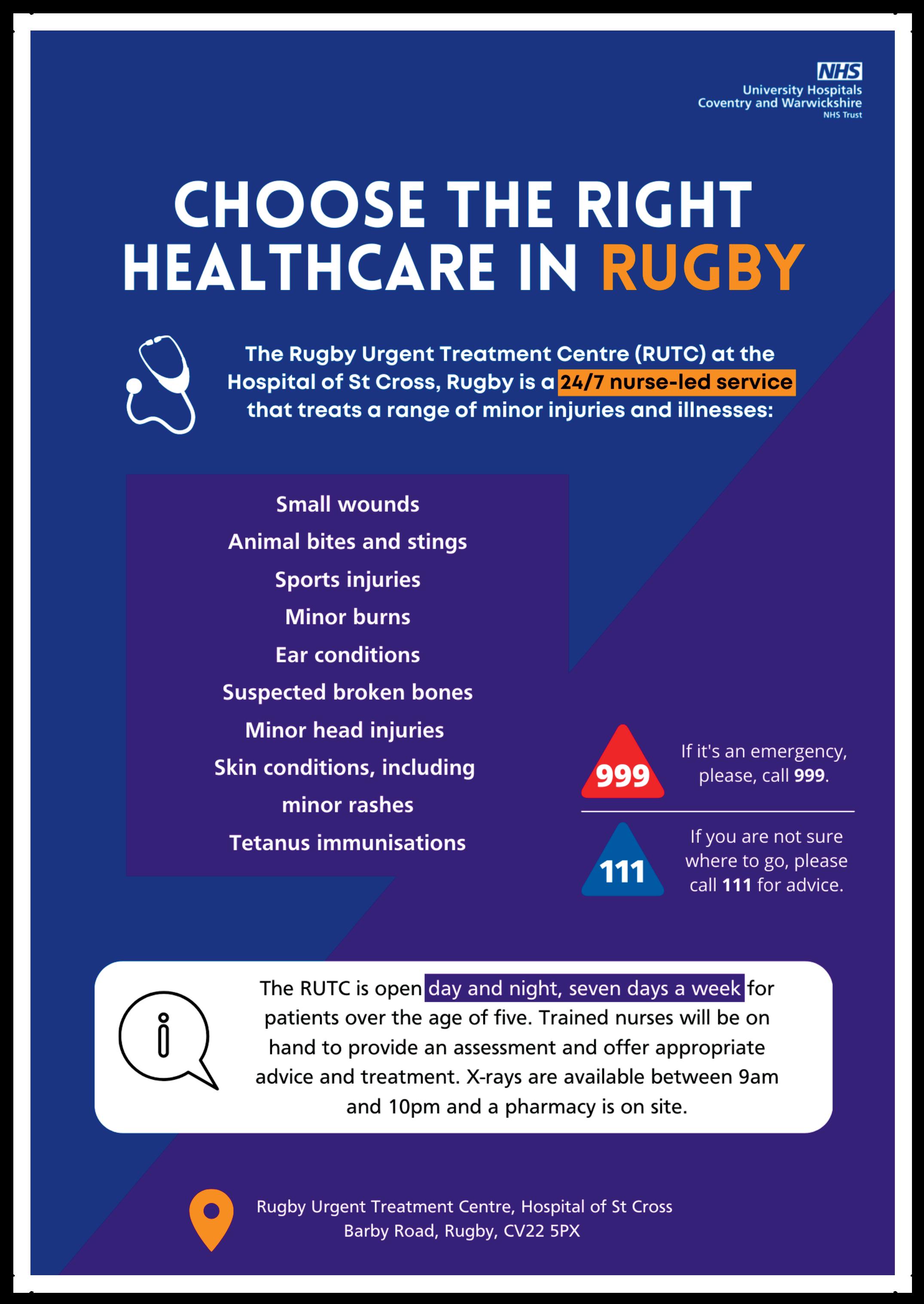 Age UK (Cov&Warks) 01788 552540 Benn Hall 01788 533719 BT Fault line 0800 800151 Carers Trust (Opt 2 Rugby) 02476 632972 Cineworld 033 0033444 Dental Helpline 01788 539780 Draycote Water 01788 811107 Electricity - Power Loss 0800 6783105 Gas - Emergency 0800 111999 Mark Pawsey MP 01788 579499 National Blood Service 0300 1232323 National Rail Enquiries 08457 484950 NHS Non Urgent 111 NHS Urgent 999 Police (non emergency) 01788 541111 Royal British Legion 0777 3775370 Rugby Art Gallery & Museum 01788 533201 Rugby Borough Children & Family Centres 01788 579488 Rugby Borough Council 01788 533533 Rugby Dementia Care 01788 576854 Rugby Hospital Radio 01788 663493 Rugby Library 0300 5558171 Rugby Wellbeing Hub, Mind 01788 544105 Rugby NHS Primary Care 01926 493491 Rugby Theatre 01788 541234 Rugby Tourist Info. 01788 533217 Severn Trent Water 0800 7834444 St Cross Hospital 01788 572831 Stagecoach Warks 01788 535555 Volunteer Centre Rugby 01788 561293 Warwickshire Childcare 0845 0908044 Information Service 01926 742274 Warwickshire Comm.and Voluntary Action (WCAVA) Rugby 01788 574258 Warwickshire Vision Support 01926 411331 Warwickshire Young Carers Project 01926 963940