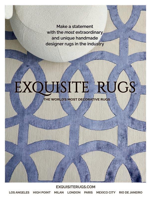 Our cover features an ‘exquisite’ handcrafted rug born from an exclusive collaboration between Exquisite Rugs and The Metropolitan Museum of Art New York. Each design translates from a significant work of fine art with the first release including five collections which will debut in High Point this spring. Design 5600 is from the Antique Loom Collection. exquisiterugs.com