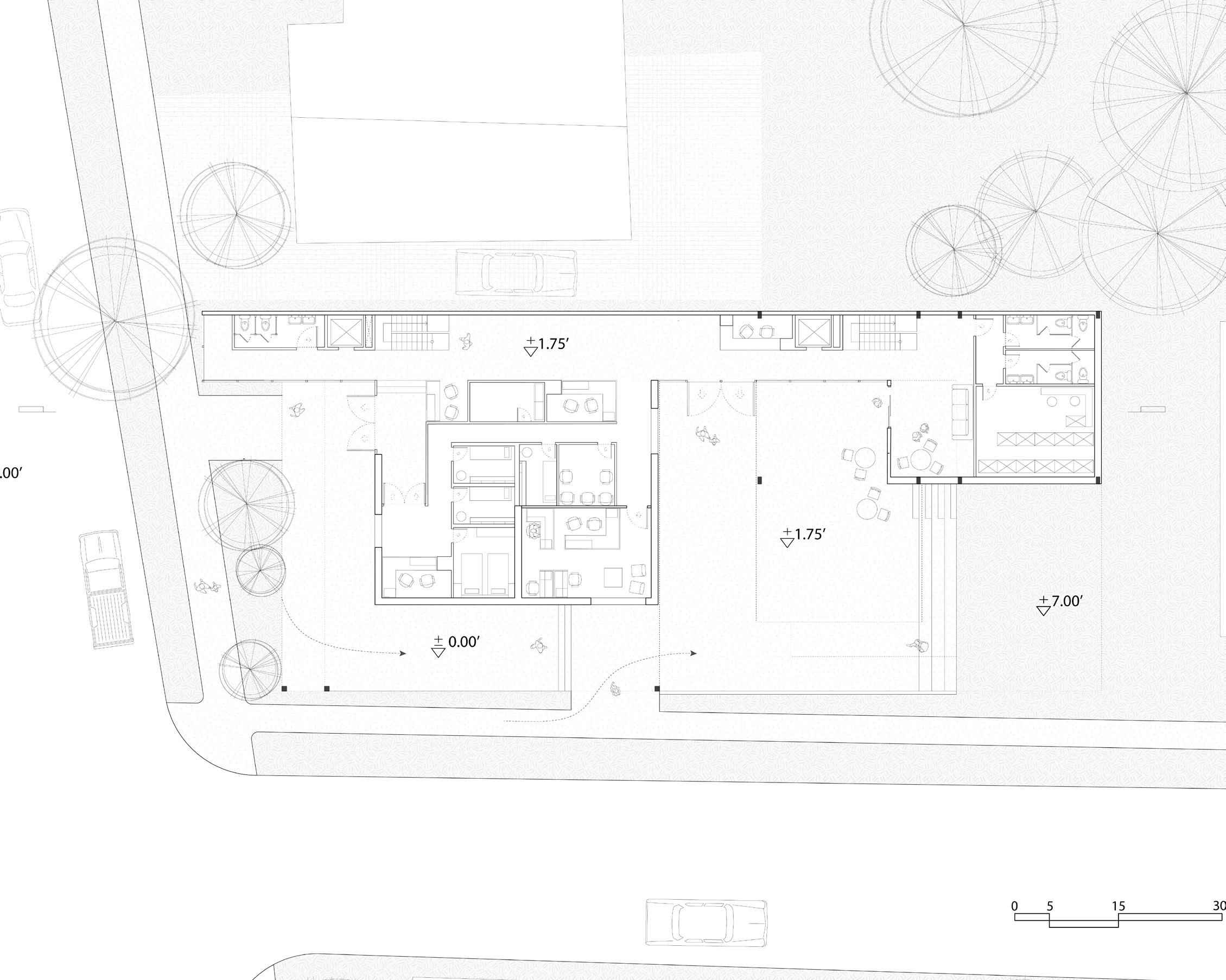 The site is situated adjacent to private residences along the western boundary and public property to the east. In designing the site layout, careful consideration was given to dialoguing with the surrounding context. A rigid delineation is established along the private edge to maintain privacy and separation. Conversely, the public edge is openly accessible and seamlessly integrated with the adjacent pavement, forest garden, and clinic through porous boundaries. This Creates a welcoming streetscape along the public frontage while respecting the privacy needs along the western private residences. The scheme aims to appropriately dialog with the diverse adjacent conditions through sensitive urban design interventions.