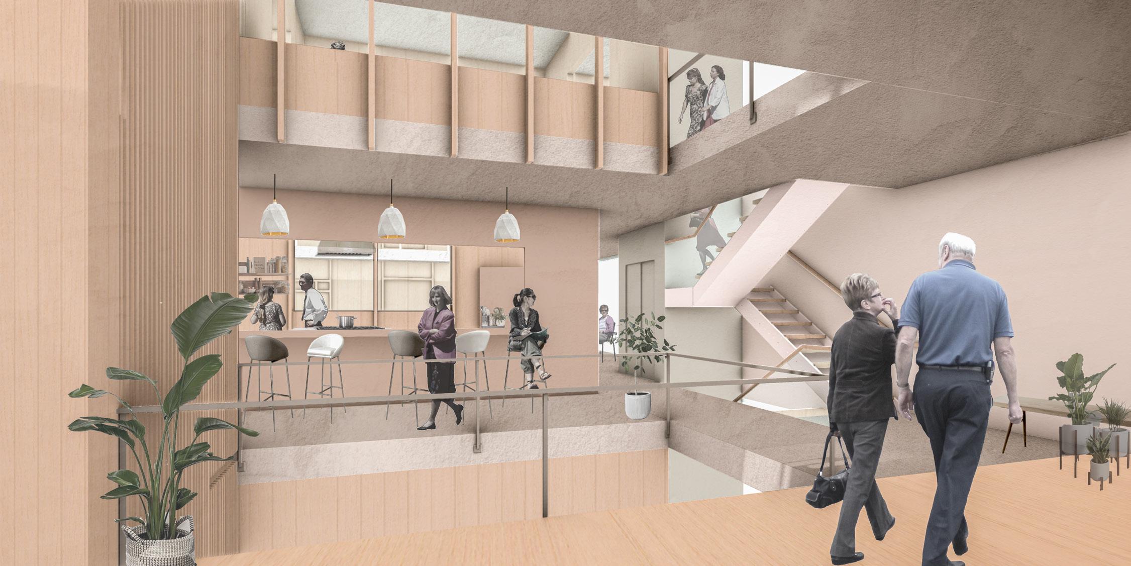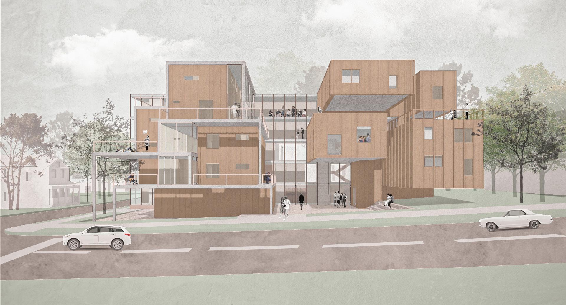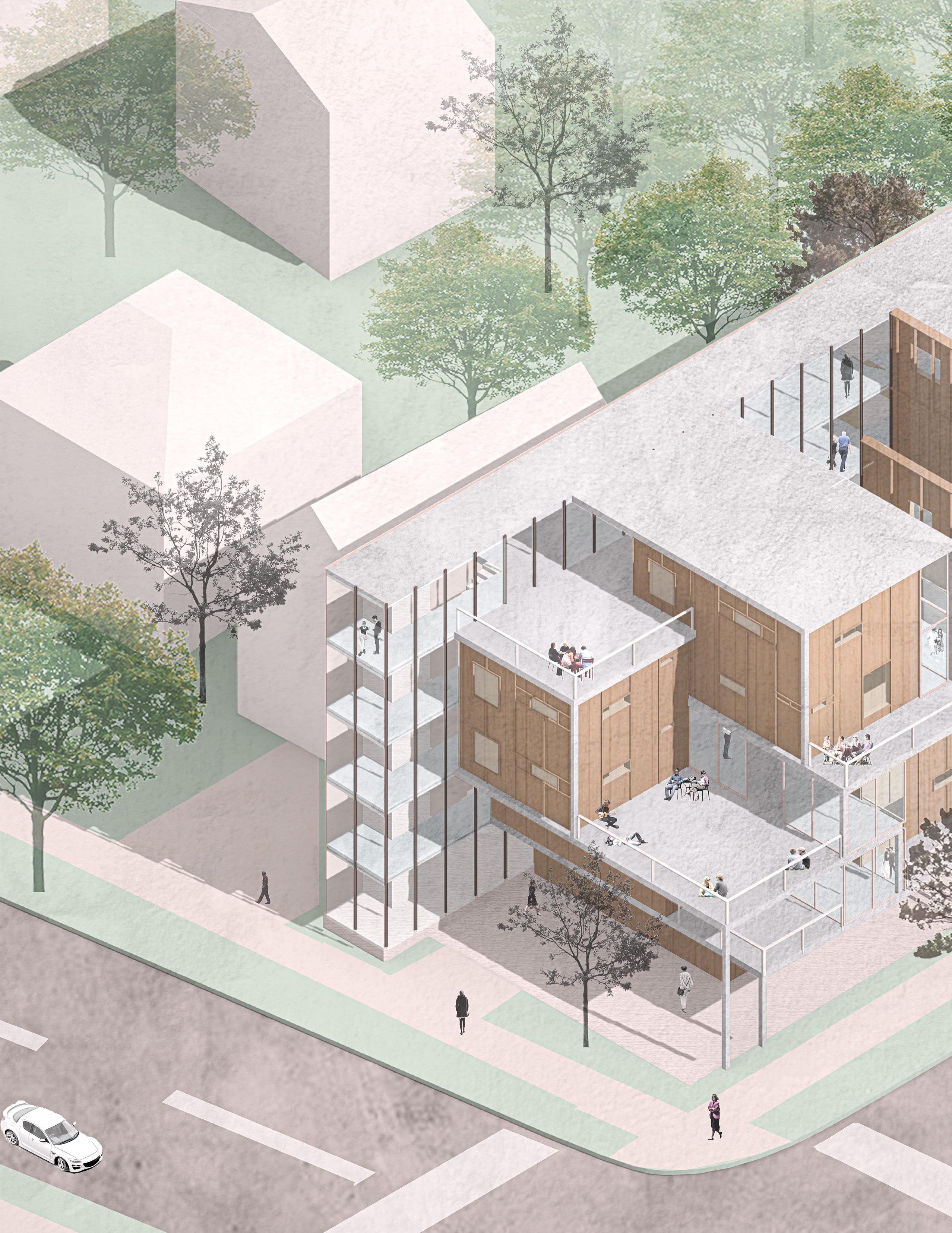 The social housing project located in the southside neighborhood of Syracuse, New York aims to serve two homeless populations: permanant residents and transitional residents. It responds to both groups’ unique needs by providing not just housing, but also assistance with social connections, job opportunities, providing an uplifting environment. Different design strategies are incorporated to serve respective group. It holistically assists the homeless beyond housing, crafting supportive spaces that help transitional residents return to the workforce and attain self-sufficiency during a difficult life stage. The overarching goal is supportive, motivational housing that uplifts these groups in need.