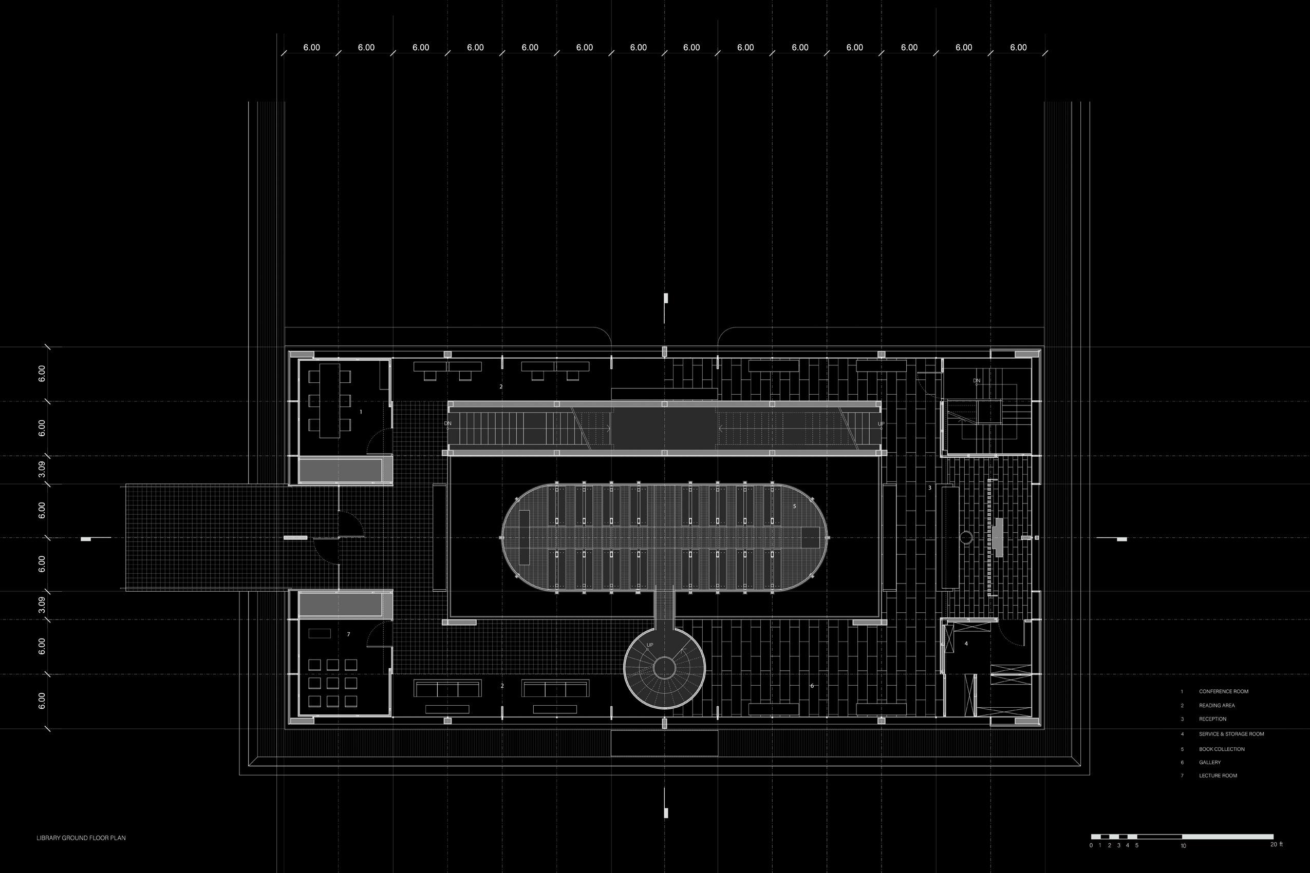 The library reflects on the church design in various aspects, staging a conversation between spiritual and intellectual architecturally. While the church embraces the concept of deformation, the library maintains its purity by combining square and oval shapes. If you imagine the church as a solid object within a mesh, then the library can be perceived as a mesh within a solid.
