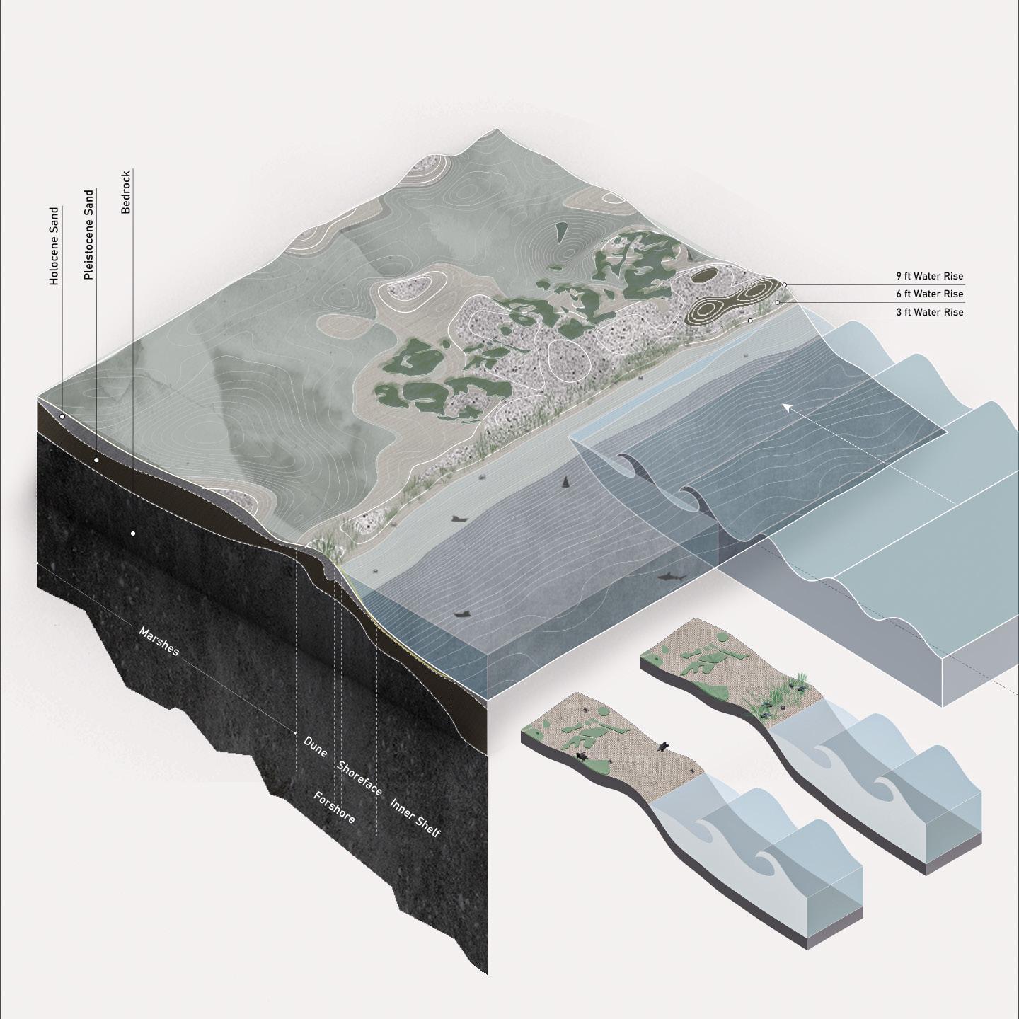 * Rhino 6, Adobe Illustrator, Adobe Photoshop SITE CONDITION | WATER vs. LANDThe archive will be the main body that store information and research about fjords’ species, as well as reproducing fish population and providing shelters to various species to balance the ecosystem. The vessels are tools that situate along the water to help filtering and reducing noise to create a better environment. The phased timeline illustrates the accumulating positive impact of introducing the vessels over a 100-year vision, ultimately transforming the fjord into a revitalized habitat and knowledge bank for future generations. The proposal provides a framework for sustainable human-nature coexistence through ecological redemption and education.